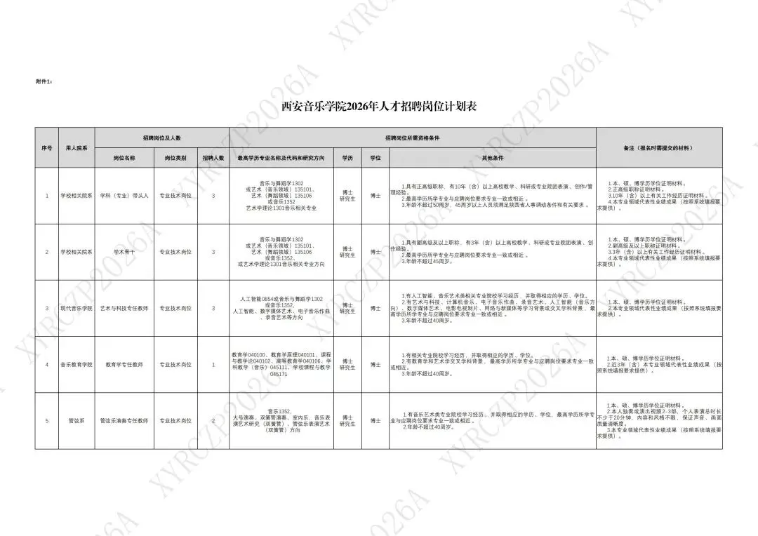 6.除上述基本条件外,须同时满足“西安音乐学院2026年人才招聘岗位计划表”(附件1)中各岗位要求的其他条件。其中,对工作经历有要求的,工作经历计算截止时间为2025年12月31日。