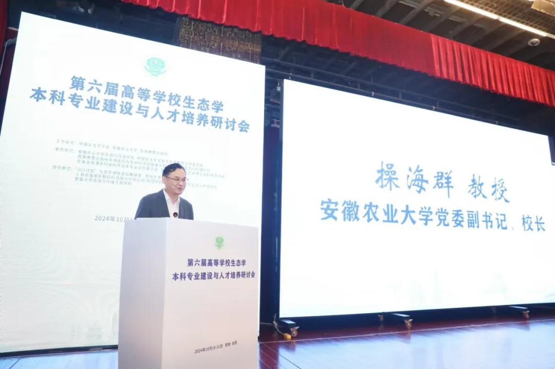 原标题:我校主办第六届高等学校生态学本科专业建设与人才培养研讨会10月18日-21日,由安徽农业大学、中国生态学学会、高等教育出版社共同主办的“第六届高等学校生态学本科专业建设与人才培养研讨会”在合肥成功举办,来自北京大学、浙江大学、中国农业大学、兰州大学、云南大学、中山大学、南京农业大学、西安建筑科技大学、厦门大学、南京农业大学、华南农业大学等54所高校、单位的170余名从事生态学研究和教学的专家、教师参加了研讨会,会议由安徽农业大学资源与环境学院承办。安徽农业大学党委副书记、校长操海群参加开幕式并致辞。