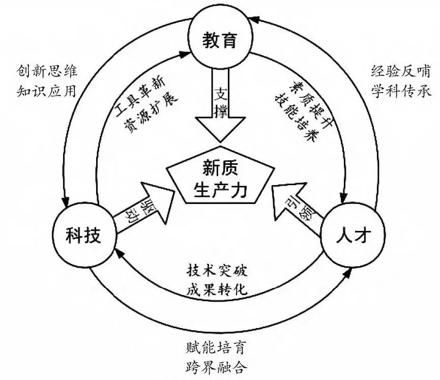 教育、科技、人才“三位一体”耦合发展,形成双向互联的循环关系。从顺时针看,教育通过课程教学提升人才综合素质,培养职业技能;人才作为科技创新的主体,以研发活动推动核心技术突破,加速成果转化;科技进步为教育提供了新工具和新资源,改进和变革教育教学方式,使教育更加个性化和高效化。从逆时针看,教育注重培育学生创新思维,鼓励将理论知识转化为具有应用价值的科技成果;科技赋予人才发挥知识和技能的潜力,不仅激发人才涌现,也加速复合型人才的培养,促进人才的跨界融合;人才将与时俱进的实践经验带回到教育中,在传承学科知识的基础上,创新教学方法,助力教育体系完善,推动教育质量全方位提升。在教育科技人才一体化循环格局下,三者共同为新质生产力发展和现代化建设注入强劲活力。