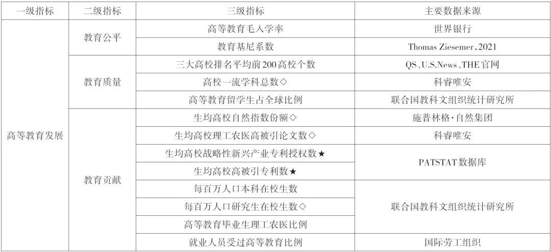 高等教育作为人才培养的主力军、科技创新的策源地,是教育、科技、人才发展的天然结合点和关键枢纽。鉴于此,本研究结合教育科技人才一体化循环系统理论,将高等教育作为教育发展的核心代表,构建涵盖“高等教育发展”、“科技创新”、“人才引领”三个维度45项指标的三级综合评价指标体系,系统考察、客观反映各国教育、科技、人才“质量优不优、贡献大不大、效能高不高”。指标选择主要遵循以下原则:一是以权威研究为依托,确保科学性。本研究广泛参考国际权威报告和研究成果,遴选“可得、可算、可比”的国际通用指标,结合学理分析提炼框架并划分备选指标。二是以创新前沿为导向,突出前瞻性。本研究紧跟时代前沿趋势,围绕新质生产力背景下的新科技、新产业、新业态,积极挖掘时代特色性与发展趋势性指标,如数字化、智能化、绿色化转型,以及战略性新兴产业、技能型人才、创新型人才等。三是以数据特性为基础,提升代表性。本研究选择指标时既关注时间跨度的连续性,兼顾历史数据与动态变化的统一,也运用相关系数、主成分等统计方法识别冗余指标,使指标体系相对简洁又具有代表性。