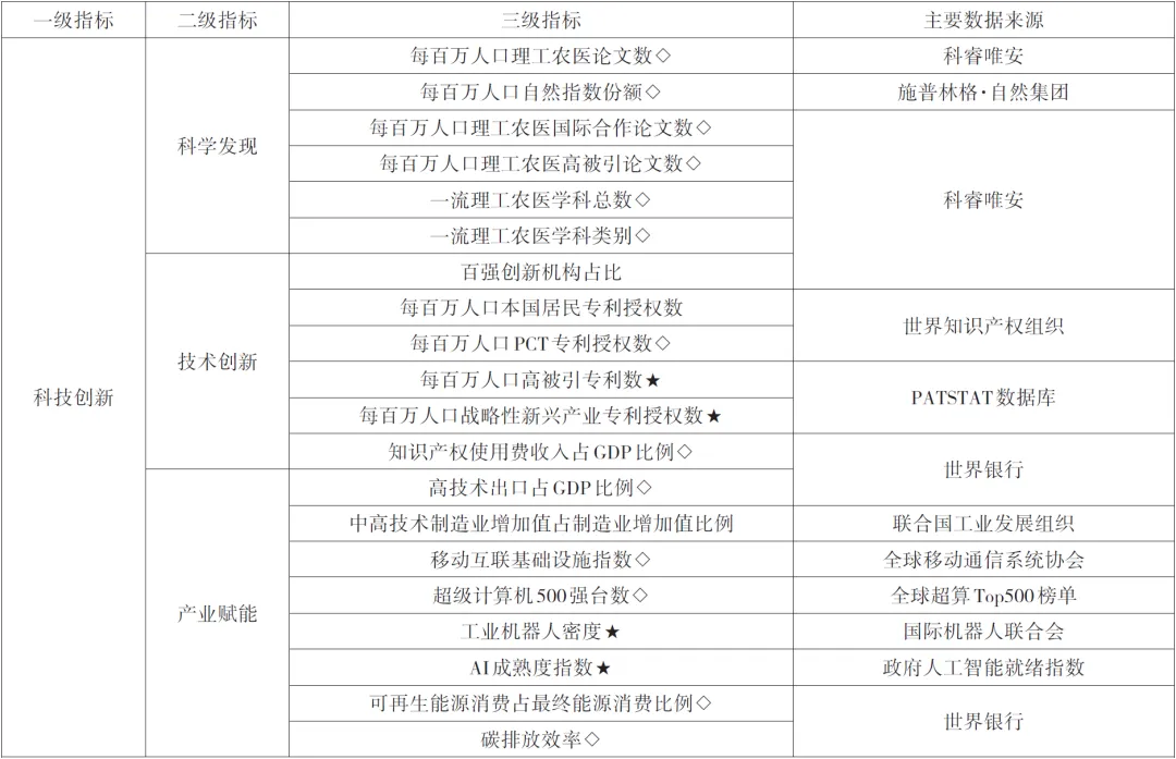在创新竞争力或科技强国研究中,指标构建主要基于两类思路:一是投入产出框架,例如,世界知识产权组织发布的《全球创新指数》将制度、人力资本和研究、基础设施、市场成熟度、商业成熟度归为创新投入,将知识和技术产出、创意产出归为创新产出。二是拆解科技内涵,中国科学技术发展战略研究院发布的《国家创新指数报告》采用创新资源、知识创造、企业创新、创新绩效、创新环境等五类指标测算。有学者辨析科技具有科学、技术和创新三层含义,认为科技强国指标体系包括科学强国、技术强国、创新强国和科技发展条件四个方面;有学者以科学发现、技术创新、成果转化、驱动发展、国际竞争五项能力衡量世界科技强国。