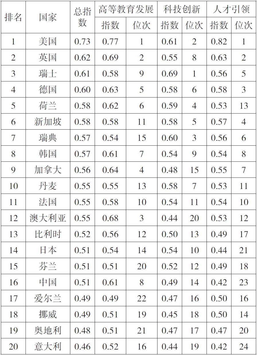 表5 2022年全球高等教育、科技、人才发展指数前20名