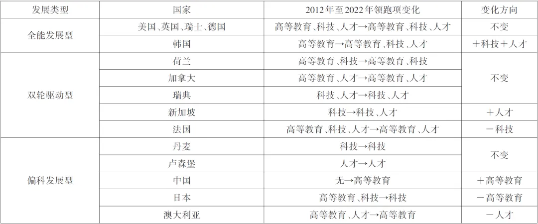 在2012—2022年,共有13个国家在高等教育方面、11个国家在科技方面、14个国家在人才方面进入全球领跑行列。比较可知,科技领先梯队相对稳定,而高等教育、人才领先梯队的竞争赶超则更为激烈,这也印证了科技创新的“马太效应”,即科技先发国家依托累积性优势形成技术锁定,而后发国家需要在制度创新与战略聚焦中寻求破局。