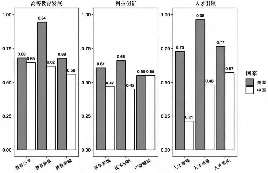 图2 2022年中美高等教育、科技、人才二级指数得分
