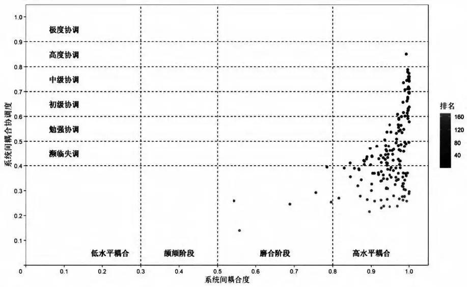 图3 2022年各国家(地区)高等教育、科技、人才的系统间耦合情况
