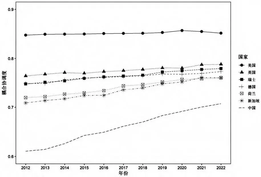 表7 2012—2022年中美高等教育、科技、人才系统内耦合比较