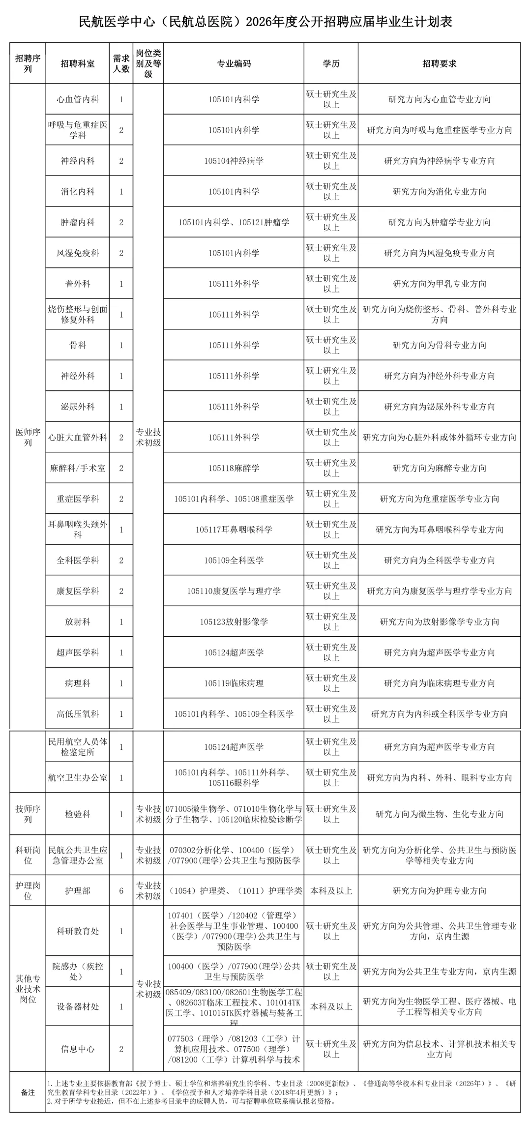 具体招聘岗位、数量及要求详见《民航医学中心(民航总医院)2026年度公开招聘应届毕业生计划表》。