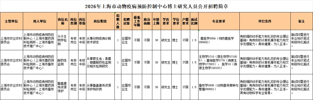 具体招聘岗位、专业要求详见附件1《2026年上海市动物疫病预防控制中心博士研究人员公开招聘简章》。
