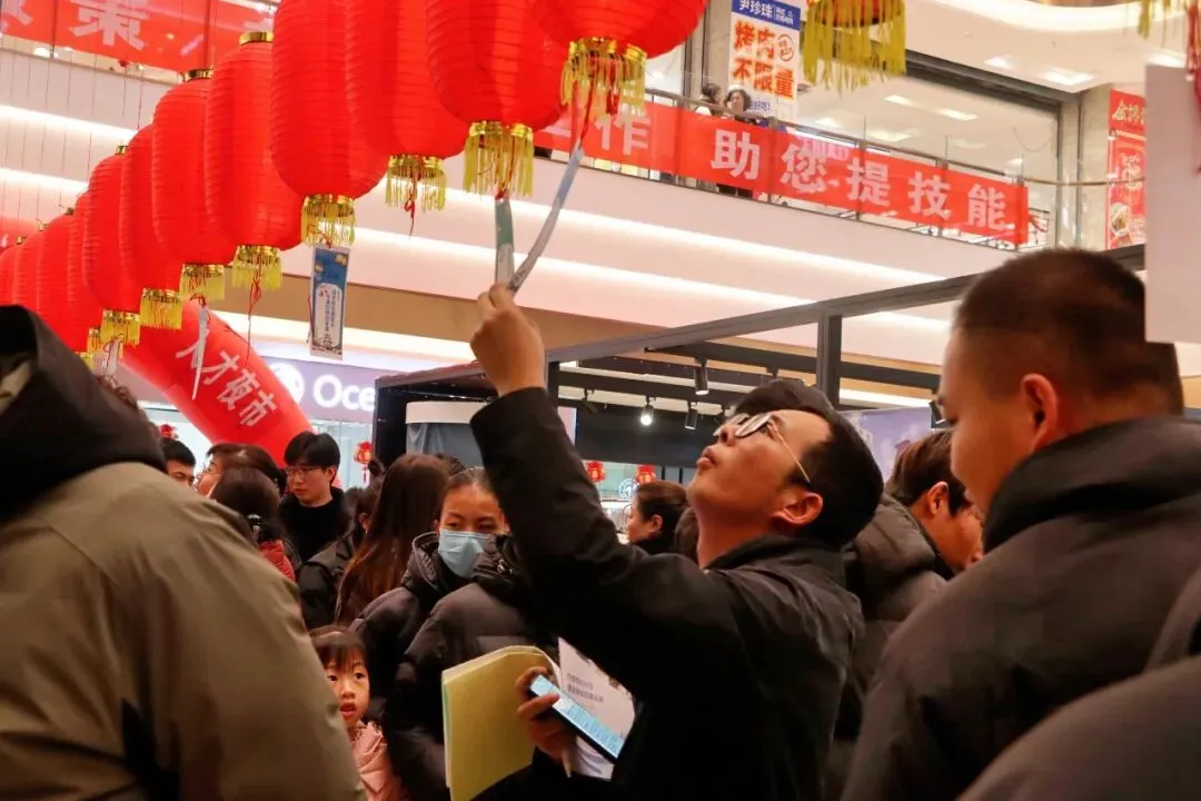 傍晚时分,位于国芳百货一楼的招聘摊位前逐渐热闹起来。现场红灯笼错落悬挂,一旁的猜灯谜区域引得市民驻足参与,指尖猜谜的趣味与求职寻岗的热意相融。25家企业带来的600余个岗位,涵盖教育、交通、化工等多个领域,吸引了求职者、应届毕业生以及路过的市民。求职摊位前张贴的招聘海报上,岗位名称、薪资待遇、任职要求一目了然,不少求职者驻足凝视、轻声交流,有的拿出手机拍摄海报留存信息,有的当场掏出简历向招聘人员细致咨询,企业招聘“摊主”们也同样热情高涨,面对求职者的各类疑问,都耐心细致解答。