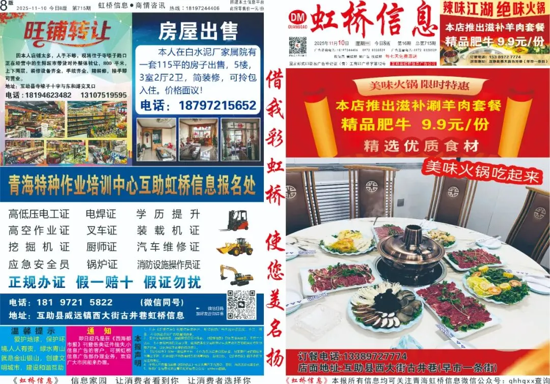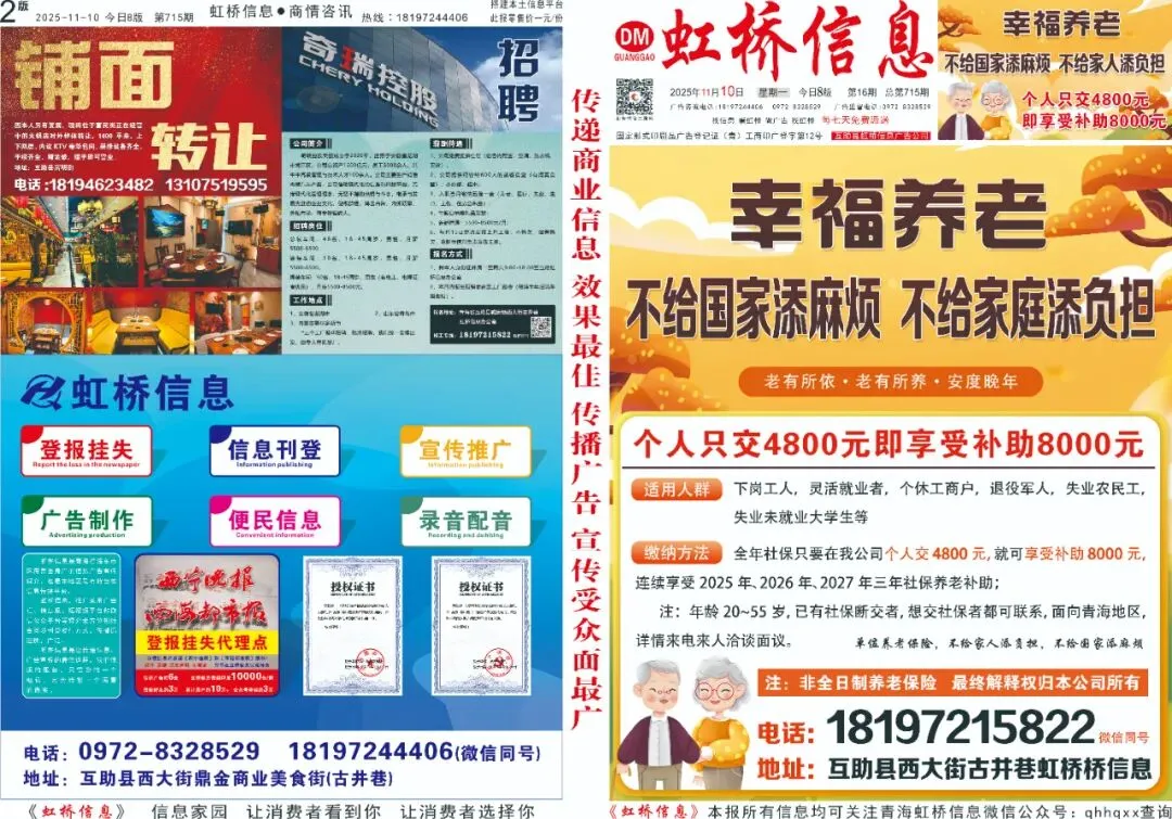 青海虹桥信息是青海省海东市区覆盖面最广的信息广告宣传媒介,也是本地区最有特色的信息传播平台。我公司信息广告覆盖海东市互助、平安、乐都,信息栏覆盖主要街道和繁华地段。信息报每周一期,每期各个县超过12000份的发行量,商场、出租车、企业、行政事业单位及学校、医院、小区等都有专人派送,实现互助、平安、乐都二城乡地区全面覆盖。青海虹桥信息,推广采用广告栏、信息报、虹桥信息网和微信公众平台等,媒介全方位相结合同步刊登发行方式,传播迅速快,广泛,青海虹桥信息是您传递信息,广告宣传,商务推广和信息查询的最佳选择,我们的合作必将助推你事业的最大成功,这也是虹桥信息最诚挚的祝愿。虹桥信息是您传递信息、广告宣传的最佳选择,我们优质的服务,只需您的一个电话,定会给您一个满意的微笑。联系电话:18197244406(微信同号)