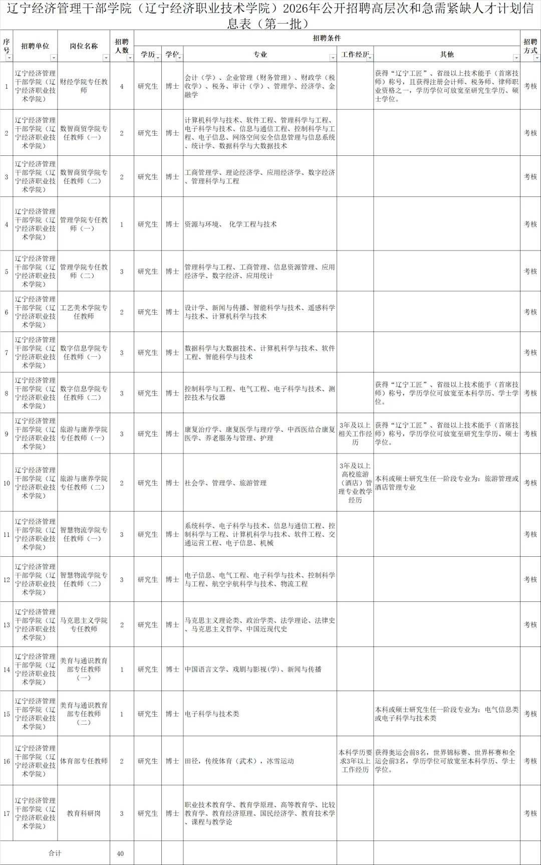 (五)岗位所需要的其他条件,详见《辽宁经济管理干部学院(辽宁经济职业技术学院)2026年公开招聘高层次和急需紧缺人才计划信息表(第一批)》。