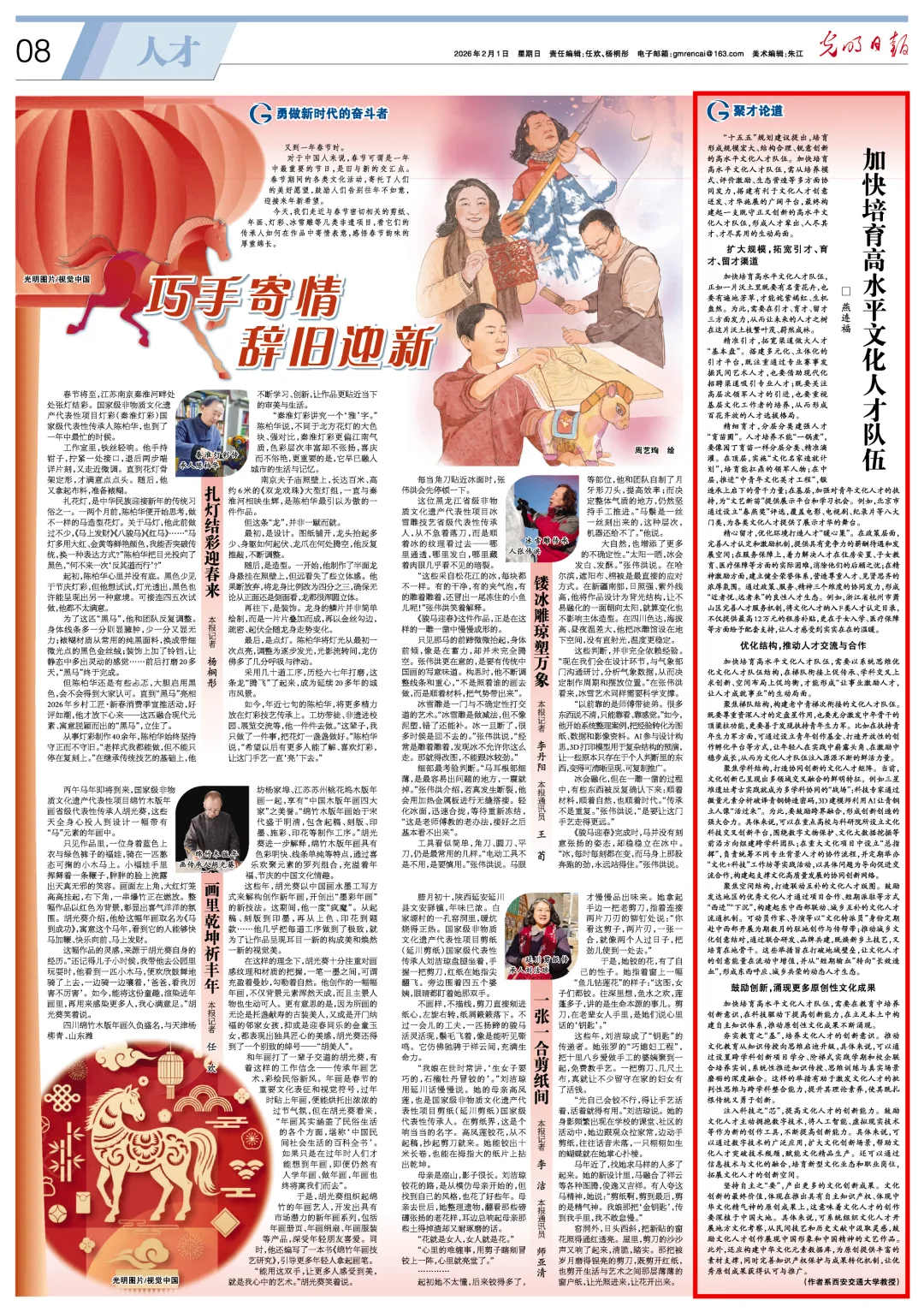 “十五五”规划建议提出,培育形成规模宏大、结构合理、锐意创新的高水平文化人才队伍。加快培育高水平文化人才队伍,需从培养模式、评价激励、生态营造等多方面协同发力,搭建有利于文化人才创意迸发、才华施展的广阔平台,最终构建起一支既守正又创新的高水平文化人才队伍,形成人才辈出、人尽其才、才尽其用的生动局面。
