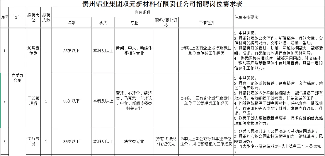 岗位要求详见附件《贵州铝业集团双元新材料有限责任公司招聘岗位需求表》。