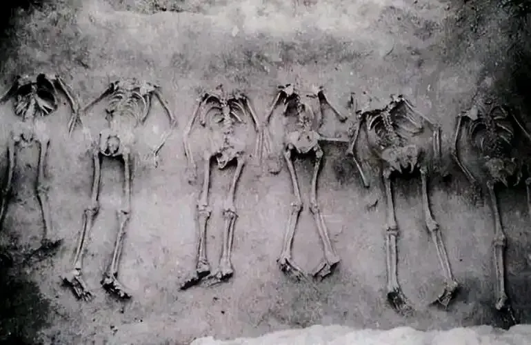 如安阳殷王陵祭祀坑中,"不少骨架是砍断,肢解后零乱地扔在坑中的。有的骨架上肢骨或下肢骨被砍,有的人架手指被砍去,有的人架脚趾被砍去,还有的人架被腰斩。
