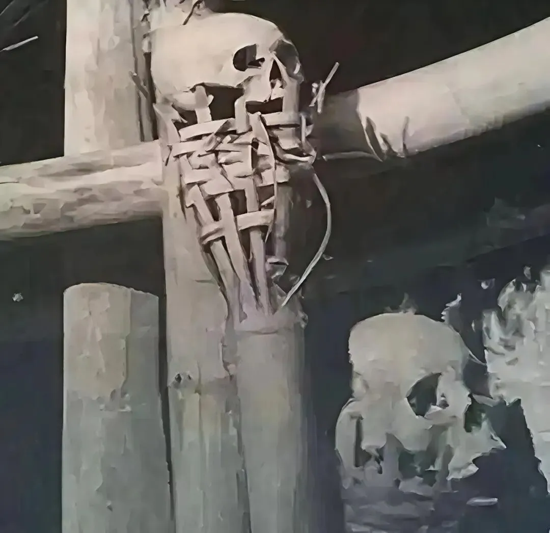 这似乎也隐隐的浮现出,上古祭祀新鼓的环节,同样充满了血腥的猎头祭祀,说不定“鼓”字中间那个象征头颅的“日”字,就是悬挂在新鼓架上的人牲头颅。