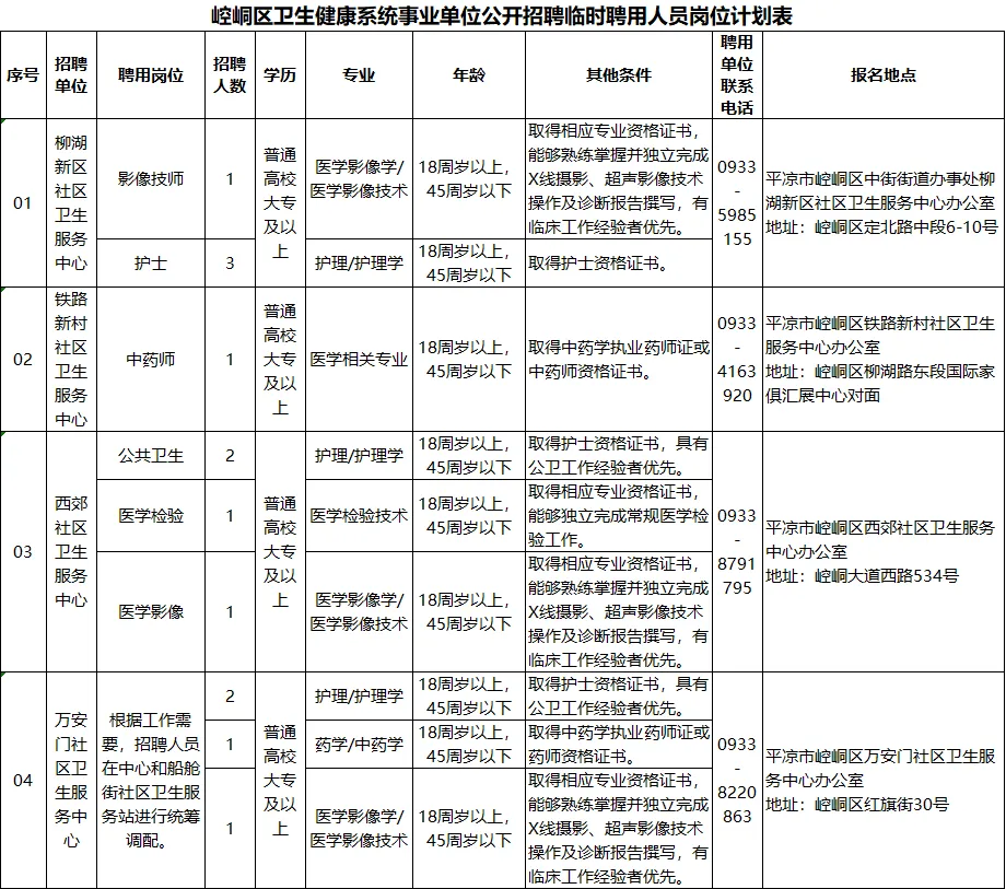 本次卫生健康系统各相关事业单位计划招聘临时聘用工作人员13名,其中:平凉市崆峒区柳湖新区社区卫生服务中心4名,平凉市崆峒区铁路新村社区卫生服务中心1名,平凉市崆峒区西郊社区卫生服务中心4名,平凉市崆峒区万安门社区卫生服务中心4名。具体岗位详见附表。