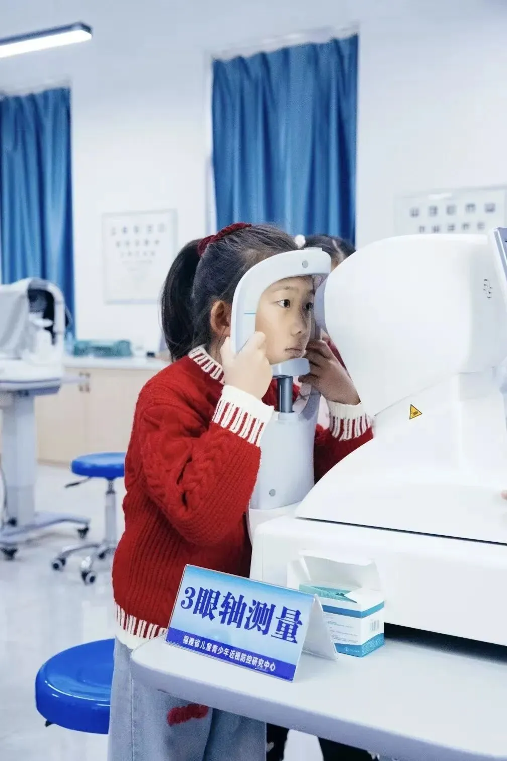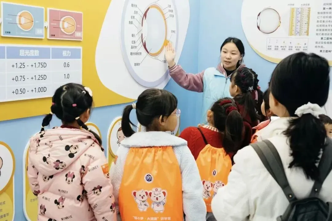 眼视光实验室里,孩子们亲身体验了完整的视力健康检查流程。在志愿者指导下,大家依次接受电脑验光、视力表检测和眼轴长度测量,将科普知识转化为可操作、可感知的实践体验,帮助孩子们建立起科学用眼的自觉意识。