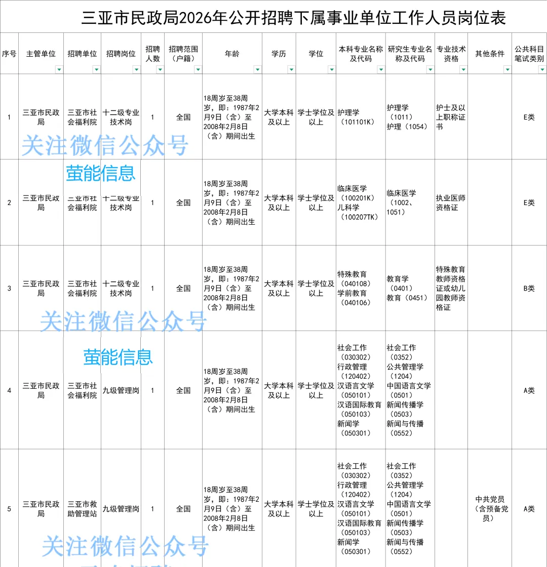 根据《海南省事业单位公开招聘工作人员实施办法》(琼人社规〔2025〕2号)等文件有关规定,现就三亚市民政局2026年事业单位公开招聘工作人员有关事项公告如下: