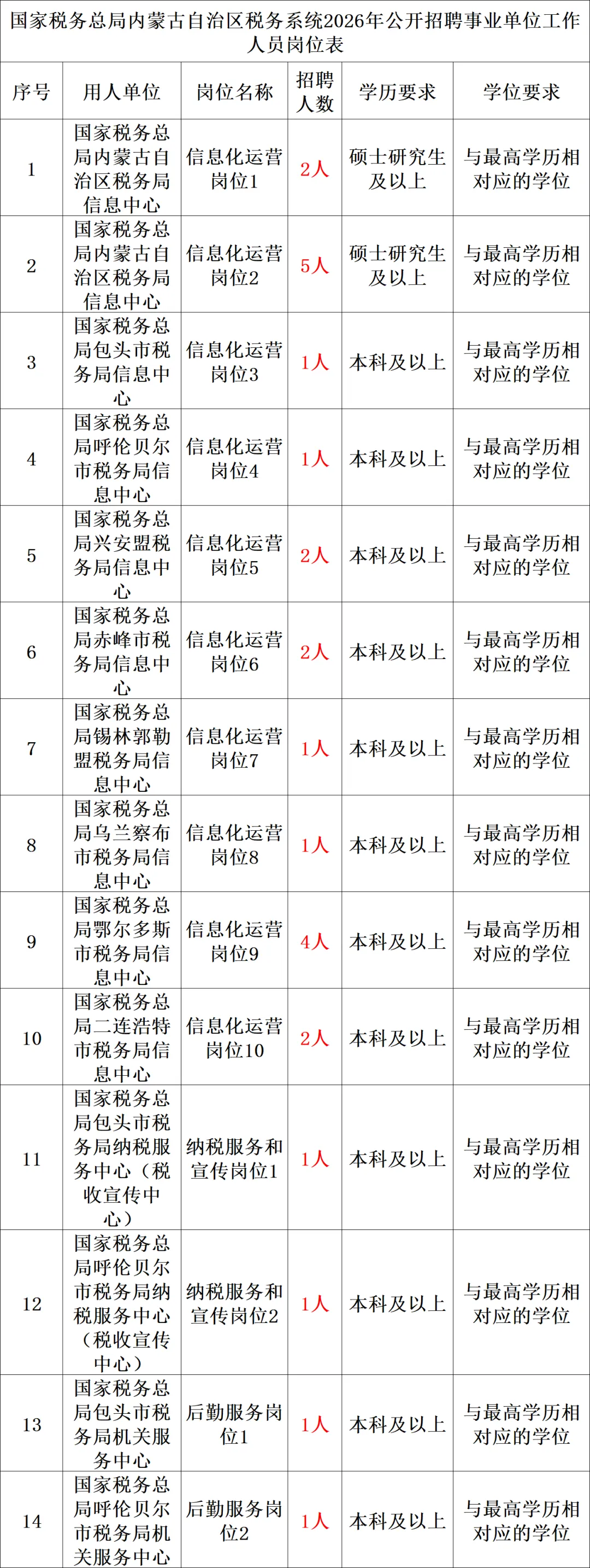 附件:国家税务总局内蒙古自治区税务系统2026年公开招聘事业单位工作人员岗位表