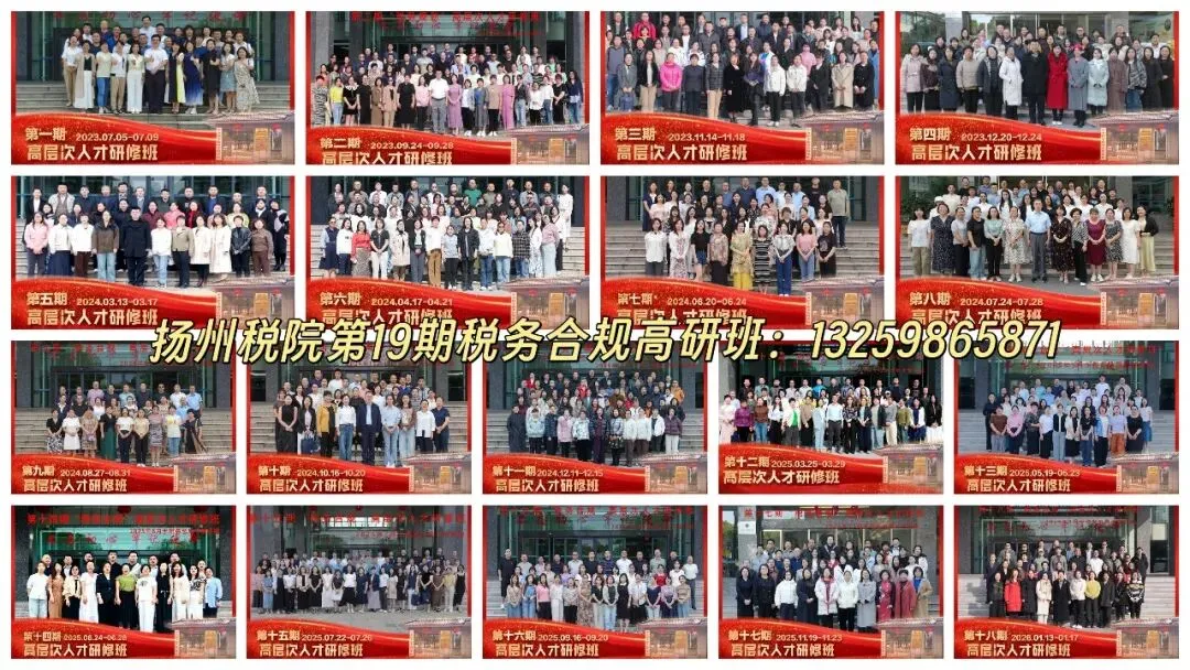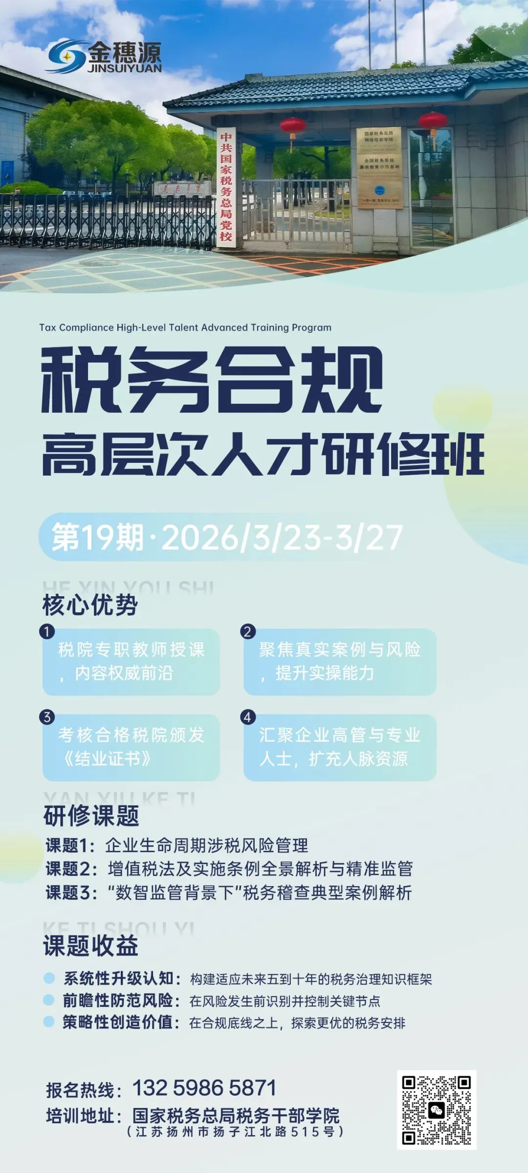 2026年3月23日-27日国家税务总局税务干部学院(扬州税院)将举办《第十九期“税务合规”高层次人才研修班》,我们很荣幸邀请贵单位董事长、总经理和财务总监、经理等相关人员参加。