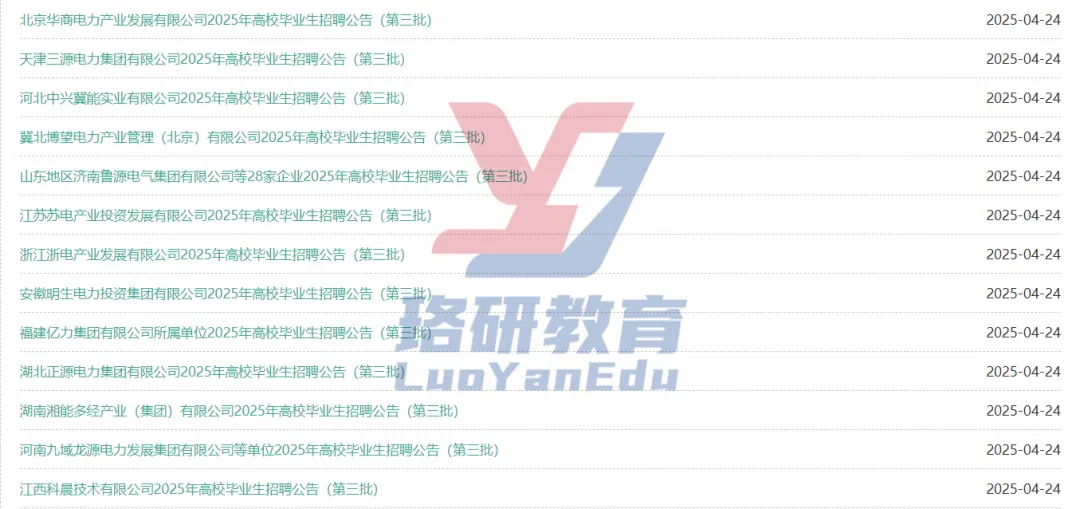 25届国网三批招聘单位是各个省公司的三产单位,此前仅在15年、16年存在第三批招聘。25届国网三批公告发布时间为2025年4月24日,报名截止时间为2025年4月30日。