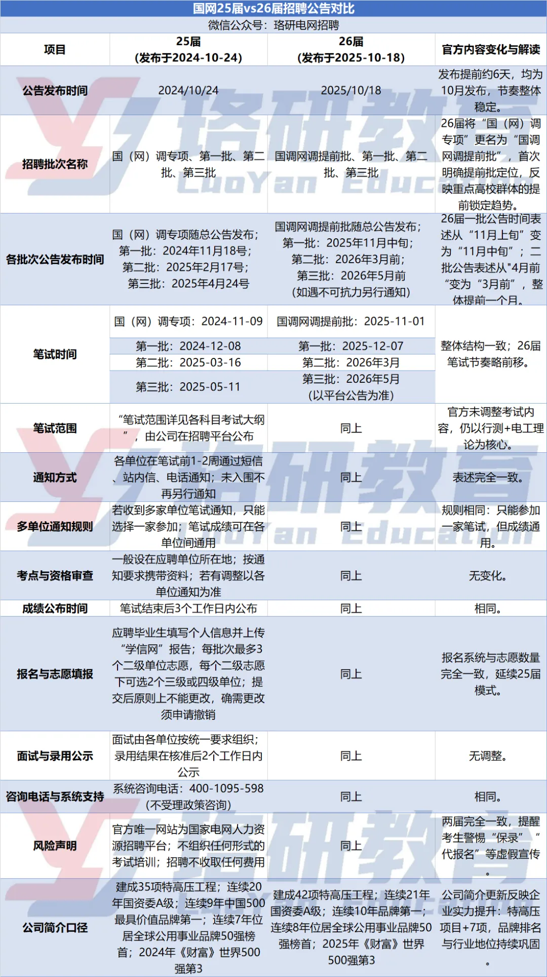 与往年相比,26届公告发布时间为2025年10月18日,比25届提前6天。公告明确:招聘依旧分为“国调网调招聘前批、第一批、第二批、第三批”四个阶段,节奏总体保持稳定。