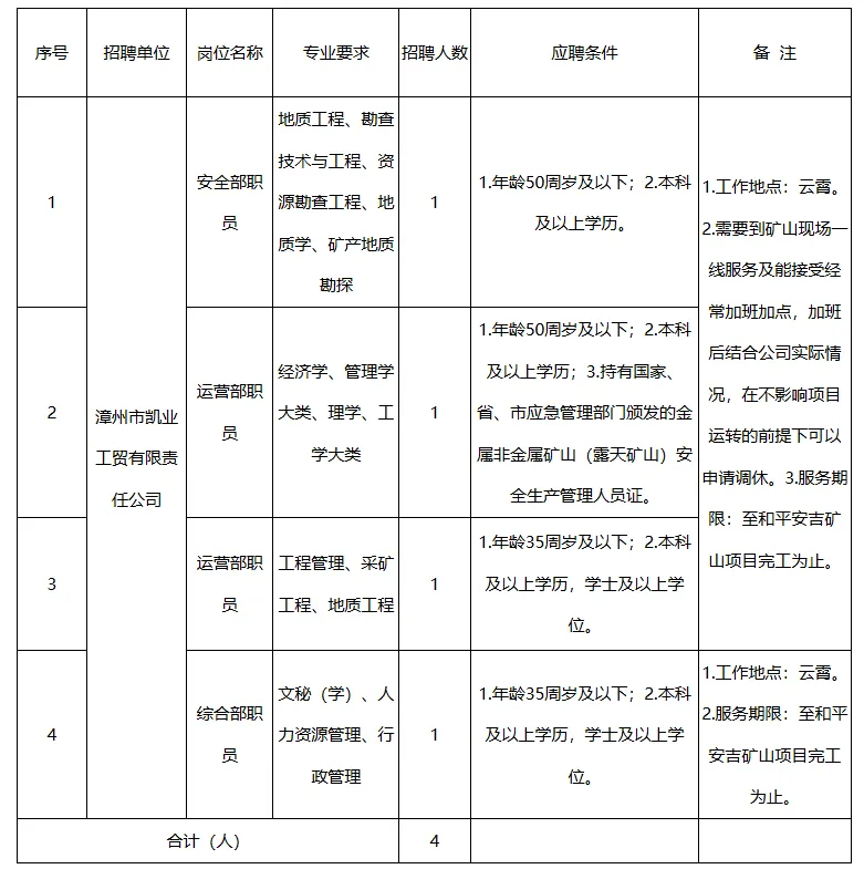 漳州市凯业工贸有限责任公司成立于2015年10月19日,是漳州市交发工贸集团有限公司全资子公司,是一家专注于建筑用石料(凝灰岩)露天开采、建筑材料销售的专业化企业。因公司发展需要,拟面向社会公开招聘市场化员工4名,有关事项如下: