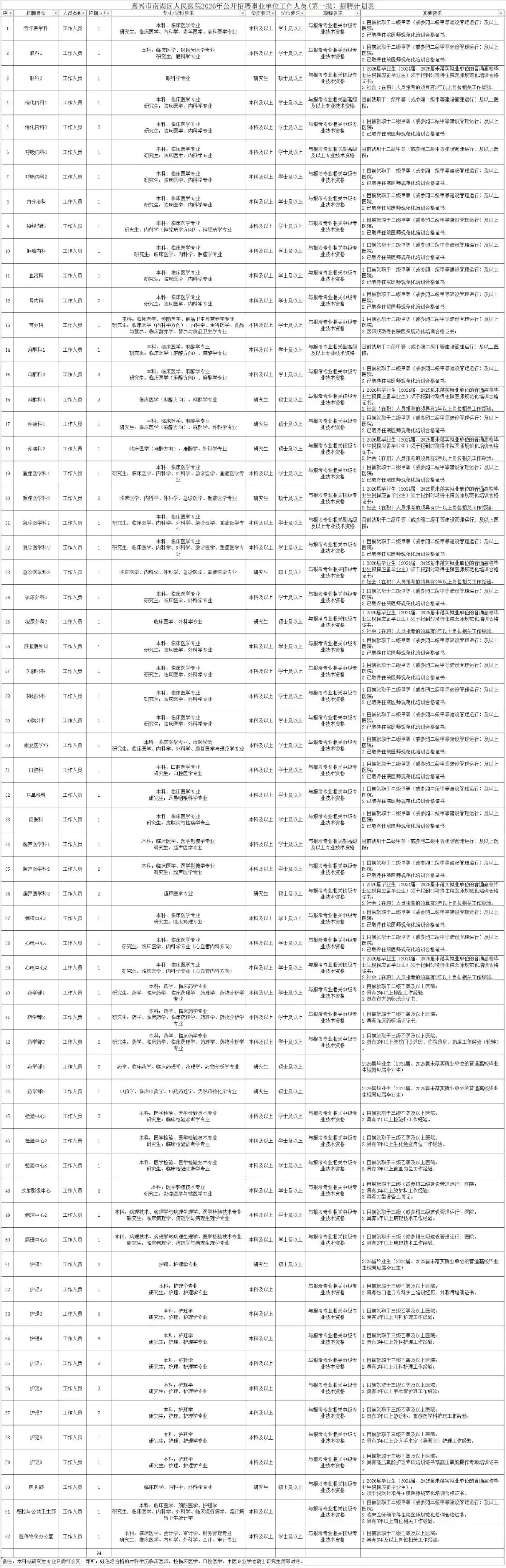 本次公开招聘计划推出岗位62个,招聘工作人员94名,为报备员额事业编制。具体招聘岗位、人数和资格条件详见《招聘计划表》(附件1)。