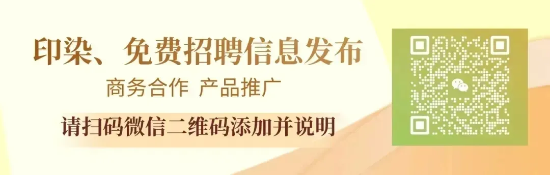 印染信息声明:推文招聘 只为方便 招聘信息比较笼统 求职途中需要谨慎 多需了解职位环境,也同时尽量避免陷入中介套路中印染企业招聘信息基本搜集于染整群内同行发布,在本公众号分享,只为需要印染职业朋友的方便,关于印染招聘信息真伪,工作职位的了解,请您看中岗位时多与身边行业朋友深入了解,避免误导、避免陷入染整中介手中。如您需要发布招聘,请您随时添加以下二维码发给我!尽所能给您提供方便!免费给大家推文发布!