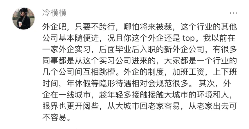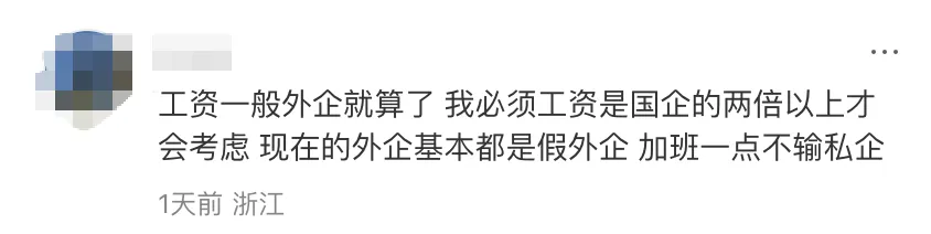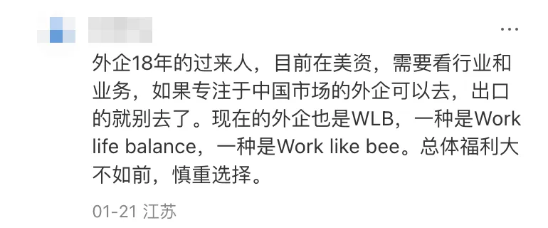 甚至有在大厂外企干了十几年的前辈吐槽,现在的福利早已大不如前,所谓的平衡已经变成了像蜜蜂一样拼命干活,如果工资没到国企的两倍,真的没必要去遭那个罪。