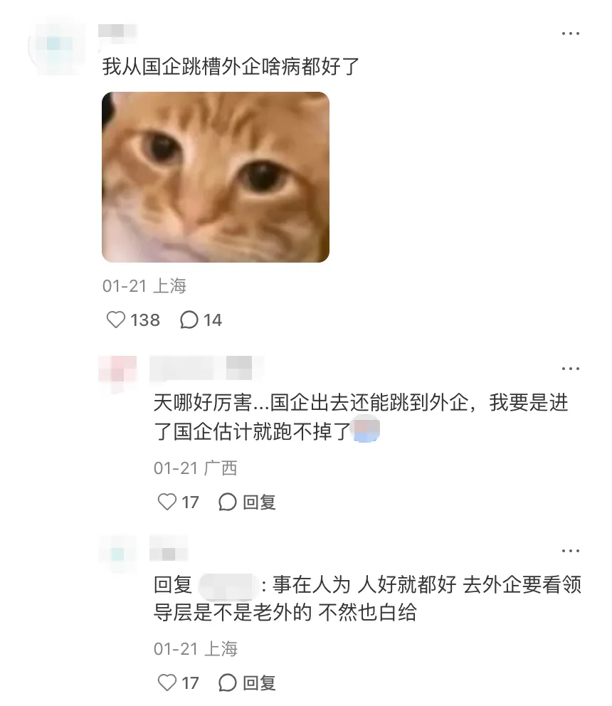 甚至有人调侃,从国企跳槽到外企后,精神内耗治好了,连身体都变好了。