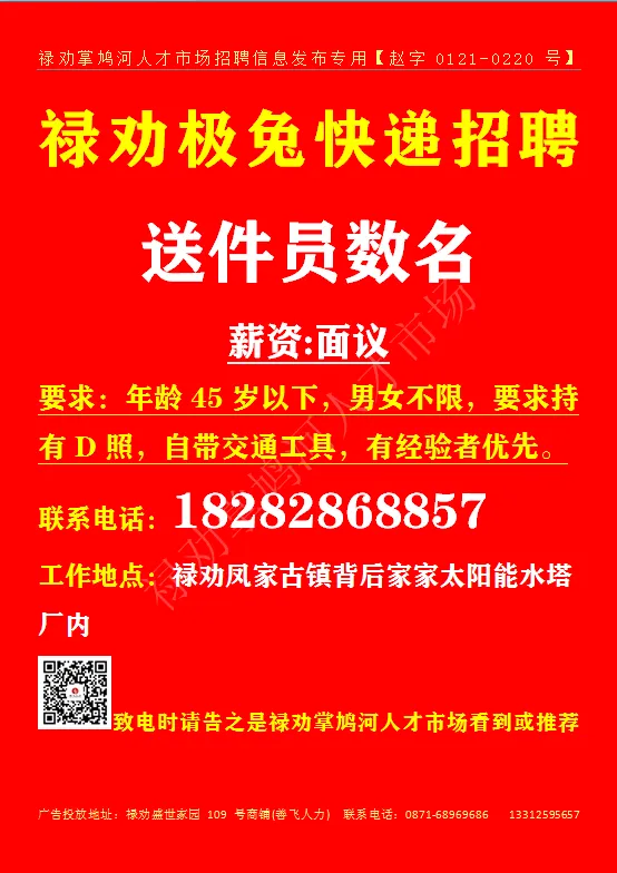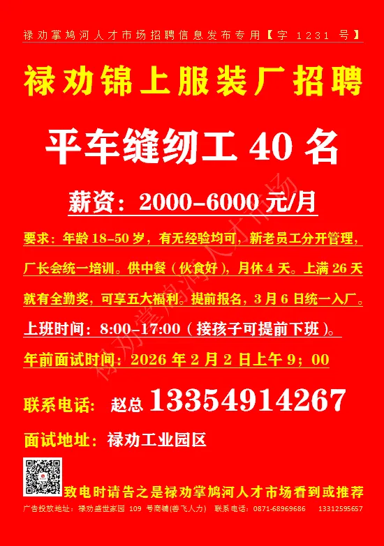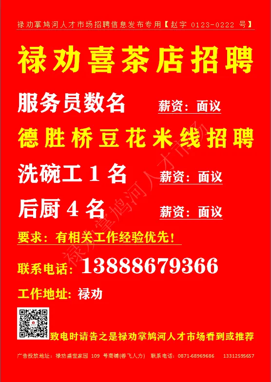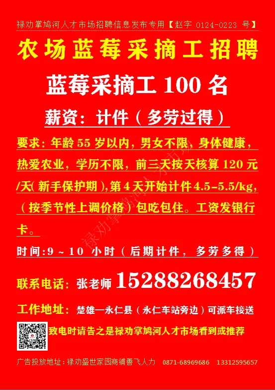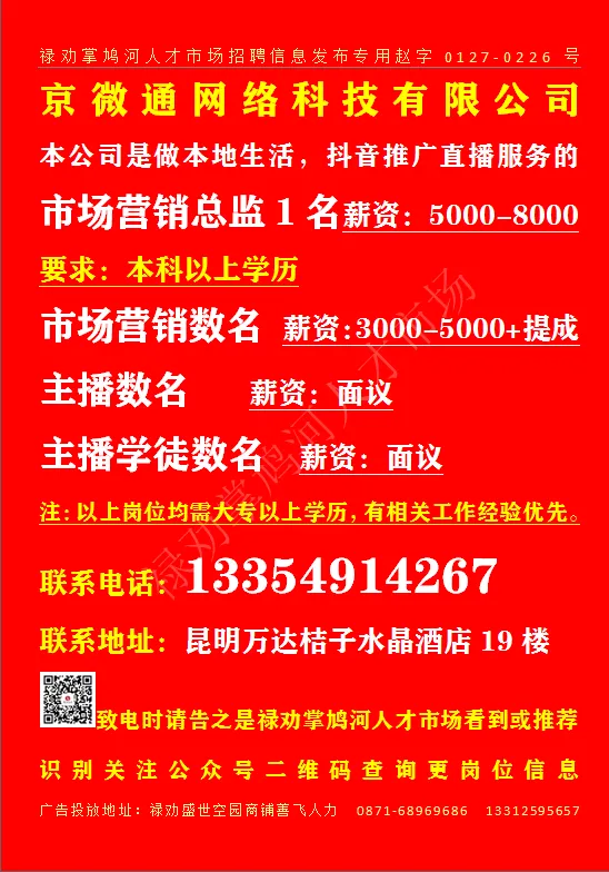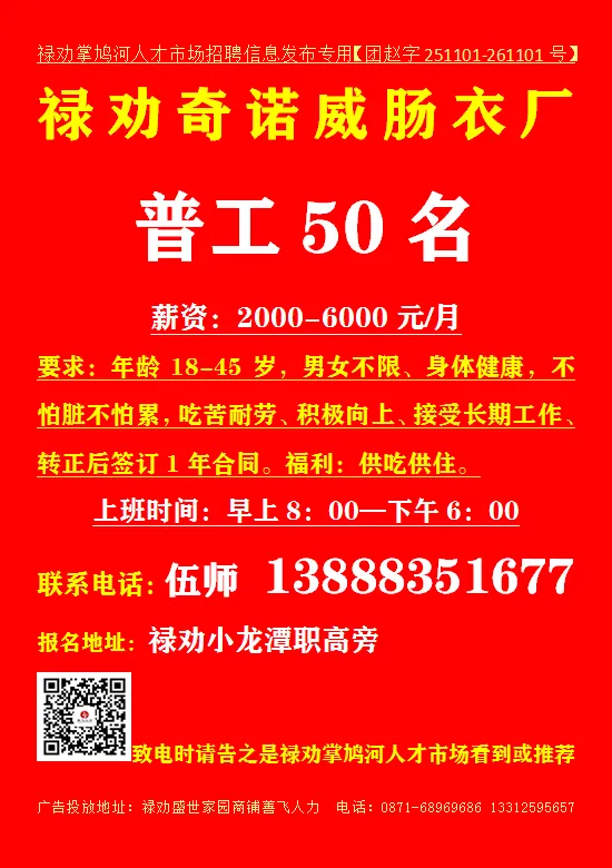 致电时请告之是禄劝掌鸠河人才市场公众号看到或推荐