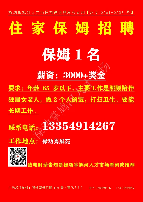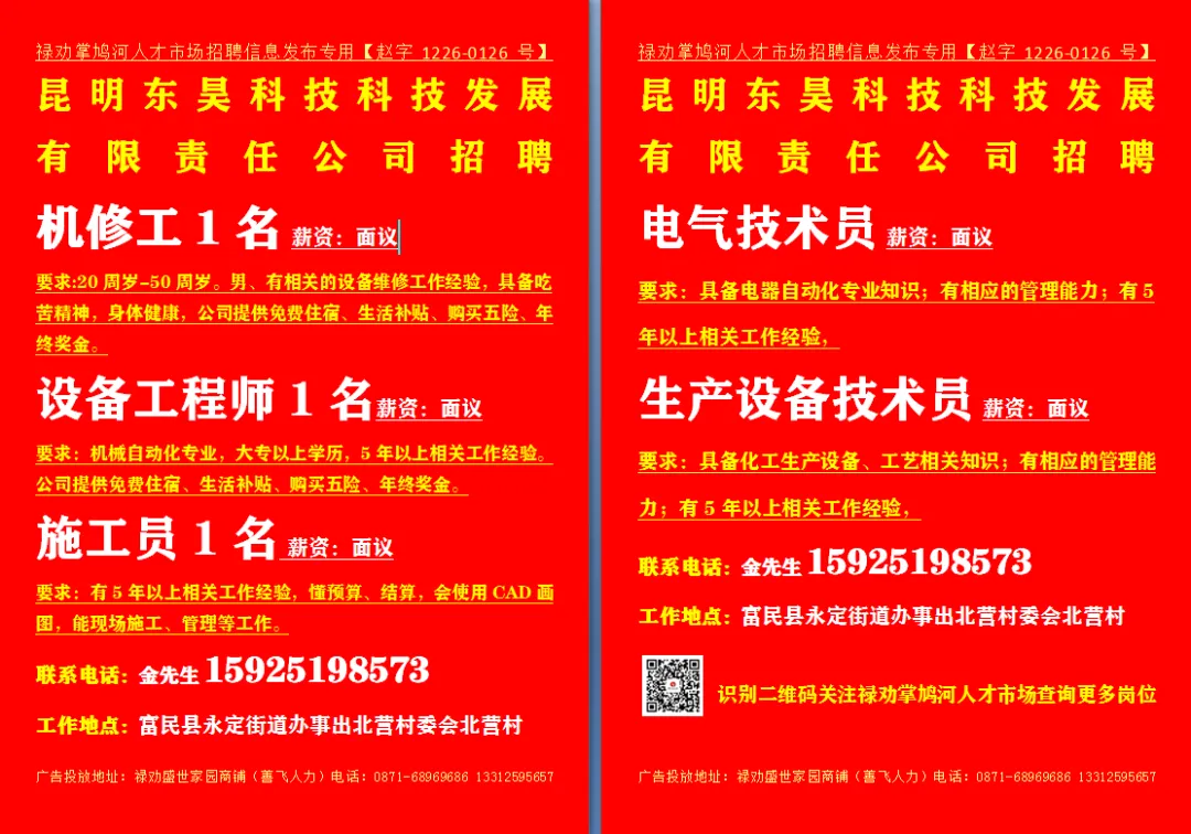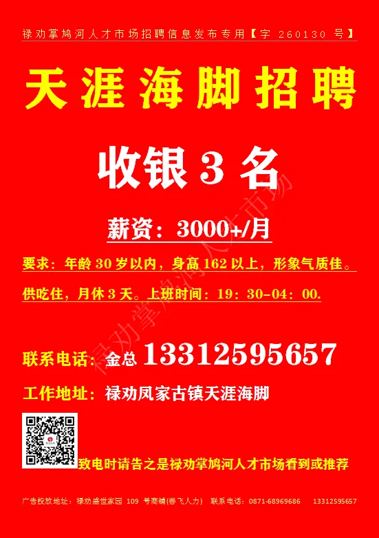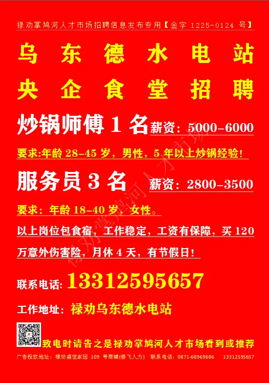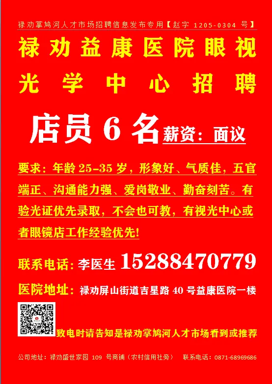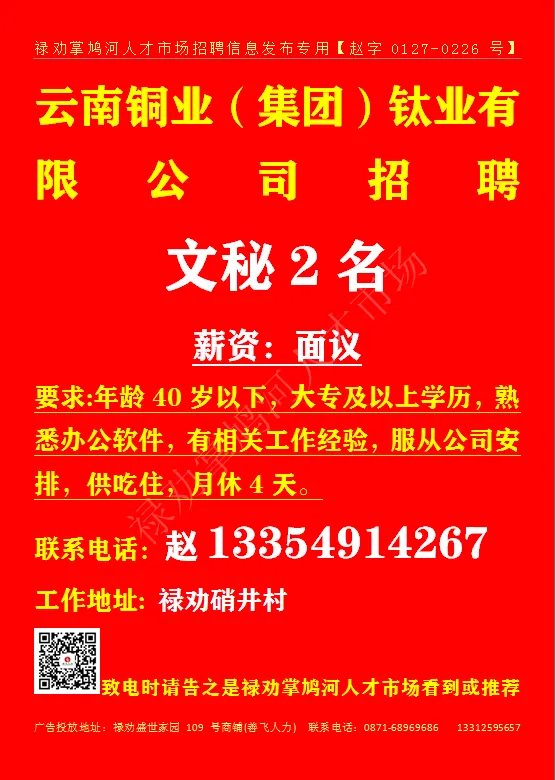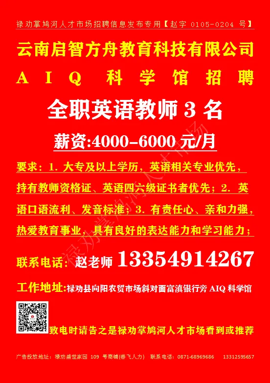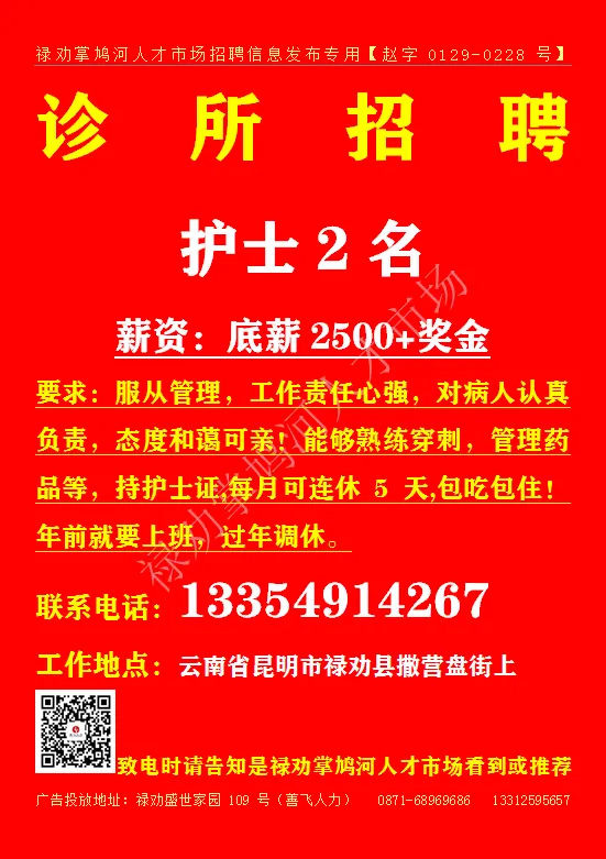 联系地址:禄劝滨河广场5栋4楼 致电时请告之是禄劝掌鸠河人才市场看到或推荐