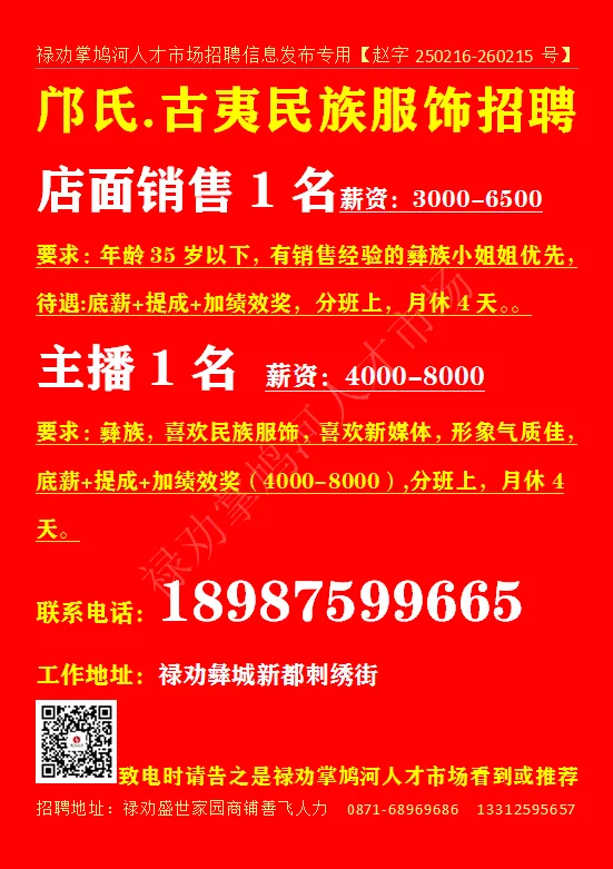 要求:彝族,喜欢民族服饰,喜欢新媒体,形象气质佳,底薪+提成+加绩效奖(4000-8000),分班上,月休4天。