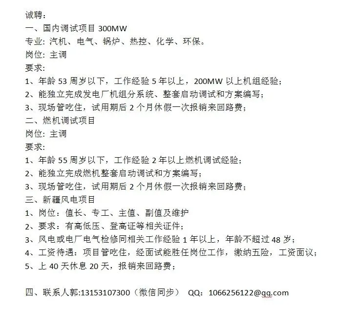 ★★★国内调试项目招聘专业: 电气、热控。岗位: 主调,副调。要求: 1、年龄45周岁以下,会做电气试验者优先;2、能独立完成发电厂机组分系统、整套启动调试和方案编写的优先录用;3、干运行专工可以考虑转调试;4、现场管吃住,试用期后2个月休假一次报销来回路费;5、工资待遇面议;6、联系人秦经理:15253180884,13335124572 微信★★★印尼检修项目6×440t/h+6×135MW流化床再热机组:2、招聘电厂机、电、炉、燃、热控检修人员数名;2、年龄不超过55岁,有中间再热机组检修经验优先,现场管吃住;3、长白班,工期长期;4、工资待遇:工资面议,经面试能胜任岗位工作,缴纳五险+意外伤害险;5、半年回国一次带薪休假15天,报销来回路费;6、联系人张经理:18678653086微信同号。