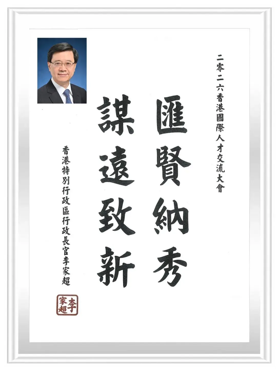 李家超特首為大會揮毫題詞「匯賢納秀 謀遠致新」