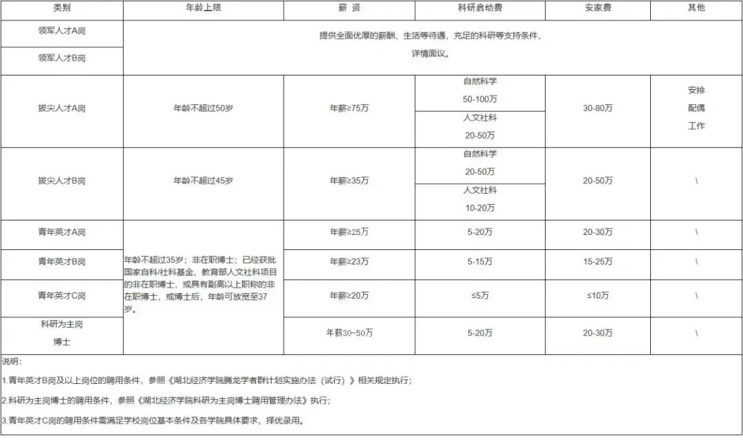 高层次人才岗位主要包括领军人才A、B岗、拔尖人才A、B岗,具体待遇、聘用条件及聘期考核参照《湖北经济学院腾龙学者群计划实施办法(试行)》执行。