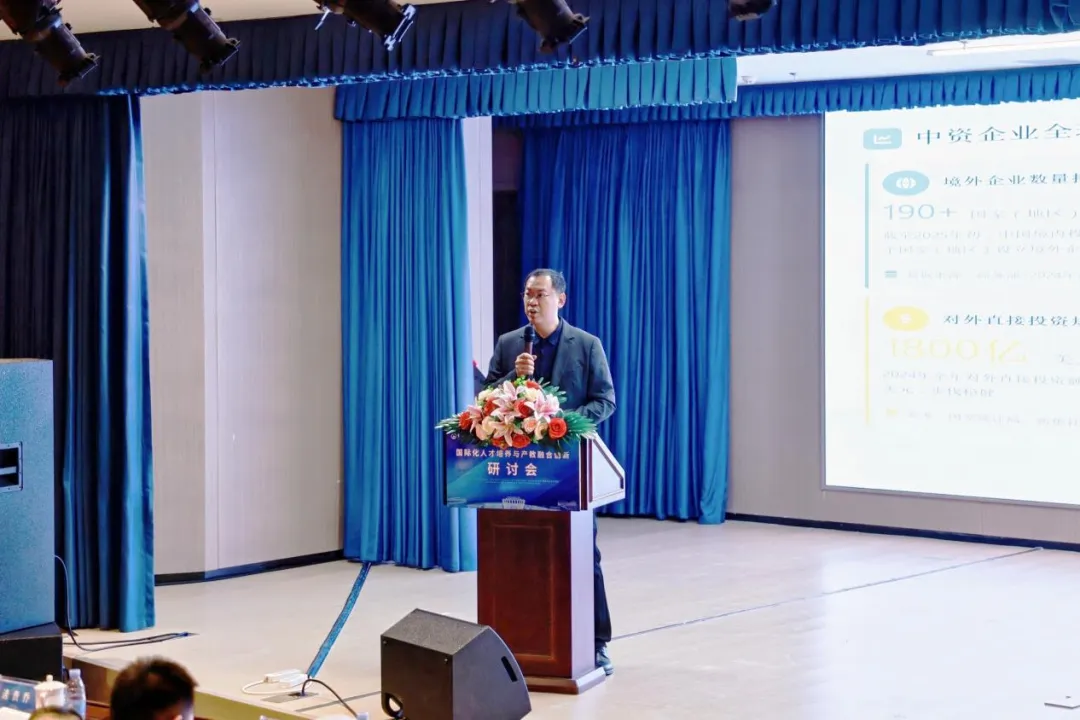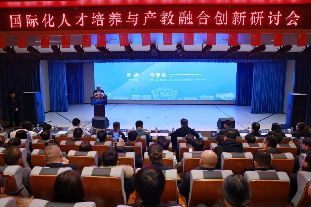 青岛市人力资源和社会保障局职业能力建设处处长杨志强、国家开放大学培训中心副主任崔明等嘉宾分别出席活动并致辞。杨志强对研讨会的召开表示祝贺,肯定了国际产业学院的建设对青岛市区域技工教育发展及国际化人才培养的积极意义;崔明则结合教育强国建设背景,介绍了国家开放大学及培训中心在推进国际化人才培养中的核心优势、规划部署与目标期望,从服务国家战略的高度阐述了双方携手共建国际产业学院的现实价值。