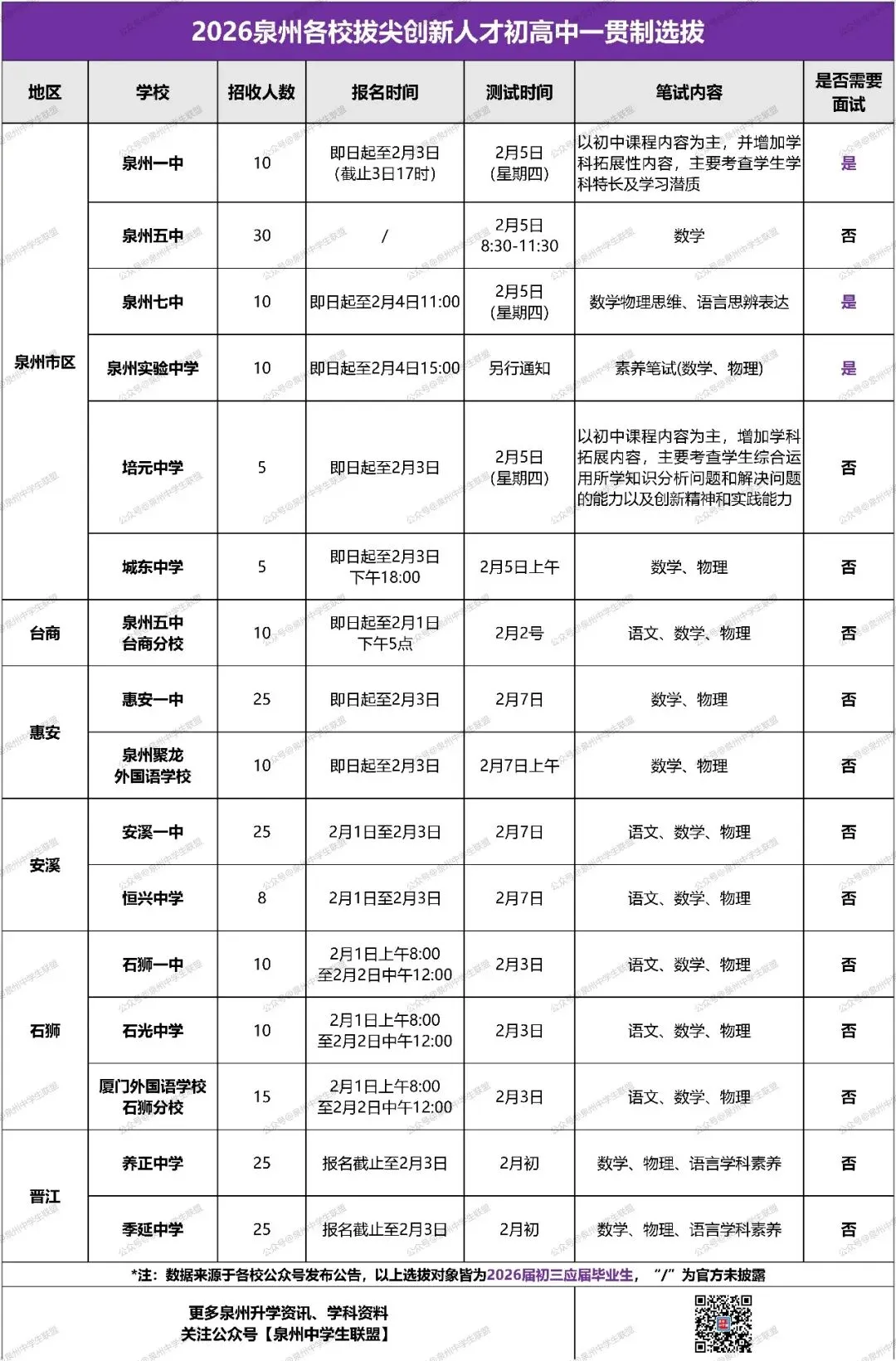 具有泉州市中心市区(丰泽区、鲤城区、洛江区)学籍的2026届初三应届毕业生,具有一定的学科特长和创新潜质。计划遴选10人。