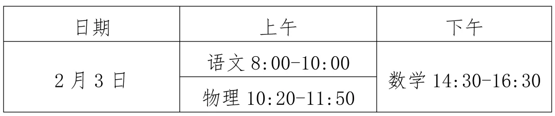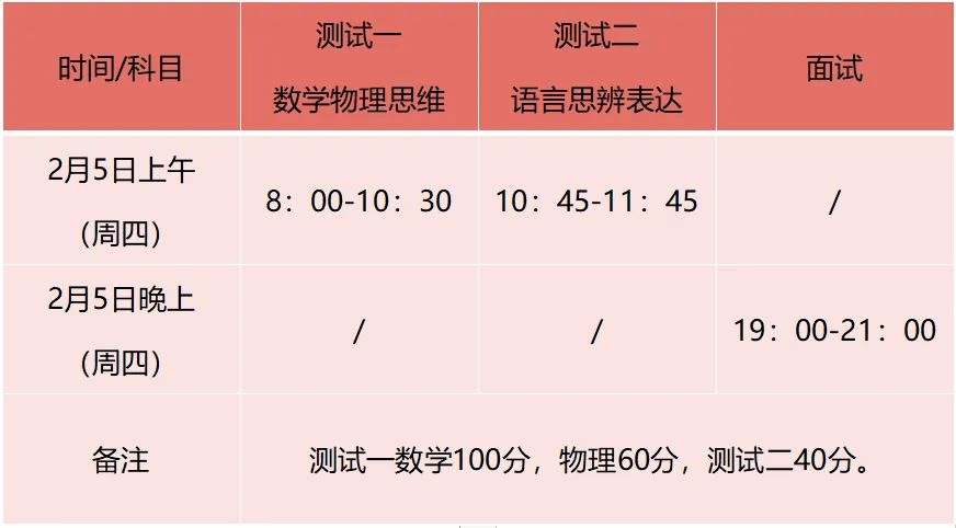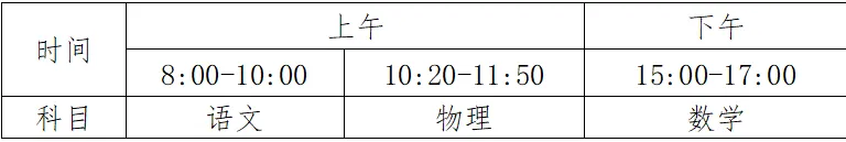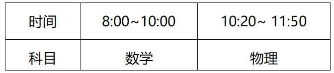 考试内容:学科素养现场测试,测试学科为语文、数学、物理,测试时长为数学120分钟,语文、物理各90分钟。