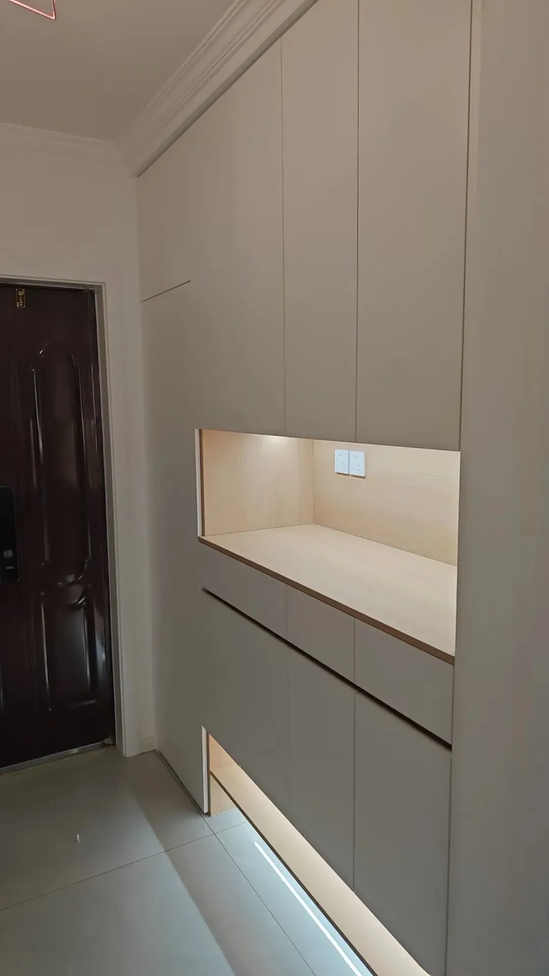 很多人以为鞋柜就是用来装鞋的,大错特错。真正好用的玄关柜,要有坐凳换鞋区、临时挂衣区、钥匙杂物抽屉,底部还得悬空20公分放常穿的鞋。你想想,每天进门手里拎着菜、包里装着快递、脚上踩着脏鞋,如果没有一个能坐着换鞋、随手挂外套、钥匙有地方扔的柜子,这些东西就会瞬间占领你的沙发和餐桌。一个好的玄关柜,能把外面的风尘仆仆全部挡在客厅之外。