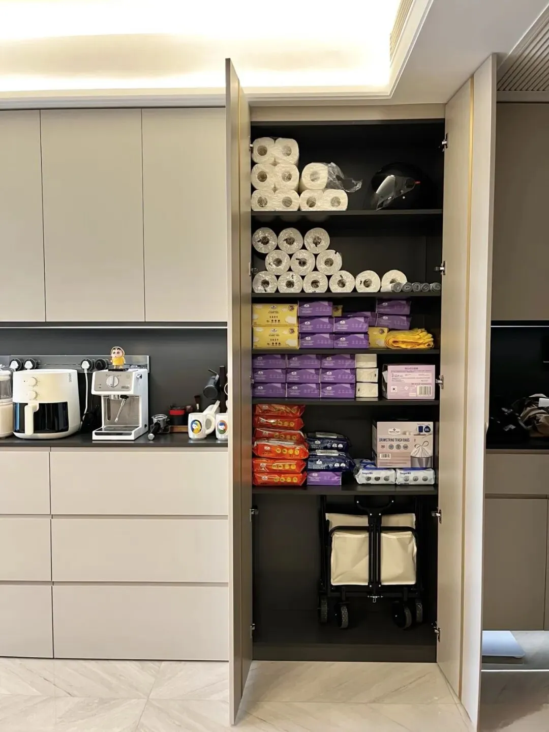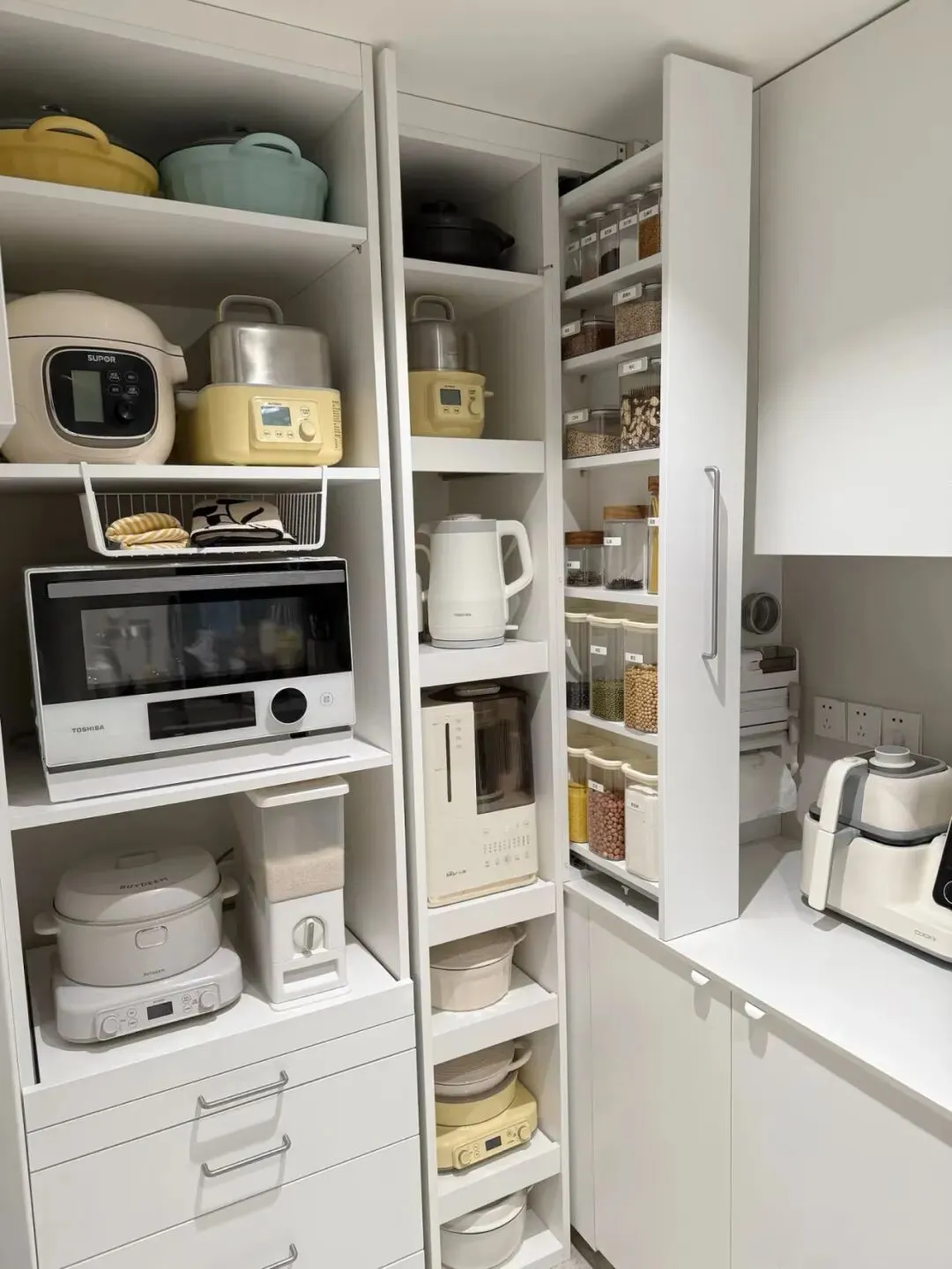 小家电是厨房台面最大的杀手,电饭煲、空气炸锅、微波炉、破壁机,每个都需要一席之地,但台面总共就那么点地方。做个高柜专门收纳小家电,用的时候拉出来,不用的时候推进去,台面才能保持清爽。