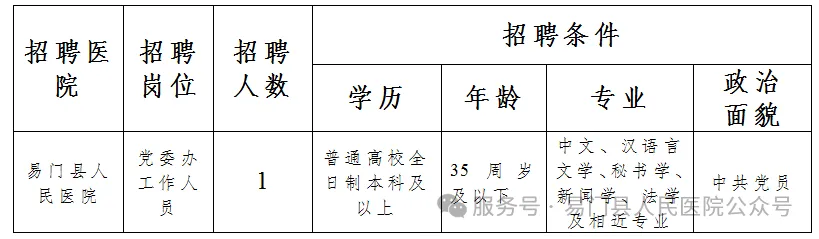 易门县紧密型医共体总医院因工作需要,面向社会公开招聘党委办编制外工作人员1人,现将有关事项公告如下。