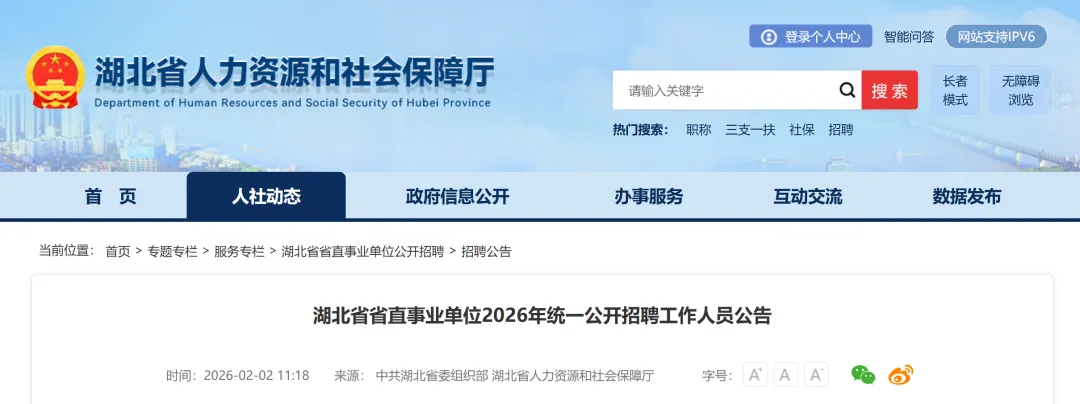 湖北省人力资源和社会保障厅门户网站“湖北省省直事业单位公开招聘”专栏(http://rst.hubei.gov.cn/bmdt/ztzl/ywzl/hbsszsydwgkzp/)和湖北省人事考试网的“事业单位招聘考试”专栏(https://rst.hubei.gov.cn/hbrsksw/zlplks/hbssydwzpks/)是此次招聘信息的官方发布平台。应聘人员可登录查询《湖北省省直事业单位2026年统一公开招聘工作人员公告》《湖北省省直事业单位2026年统一公开招聘工作人员报考指南》《湖北省省直事业单位2026年统一公开招聘工作人员岗位表》《湖北省省直事业单位2026年统一公开招聘单位联系咨询方式一览表》《事业单位公开招聘分类考试公共科目笔试考试大纲》(以下简称《公告》《报考指南》《岗位表》《联系表》《考试大纲》)等信息。