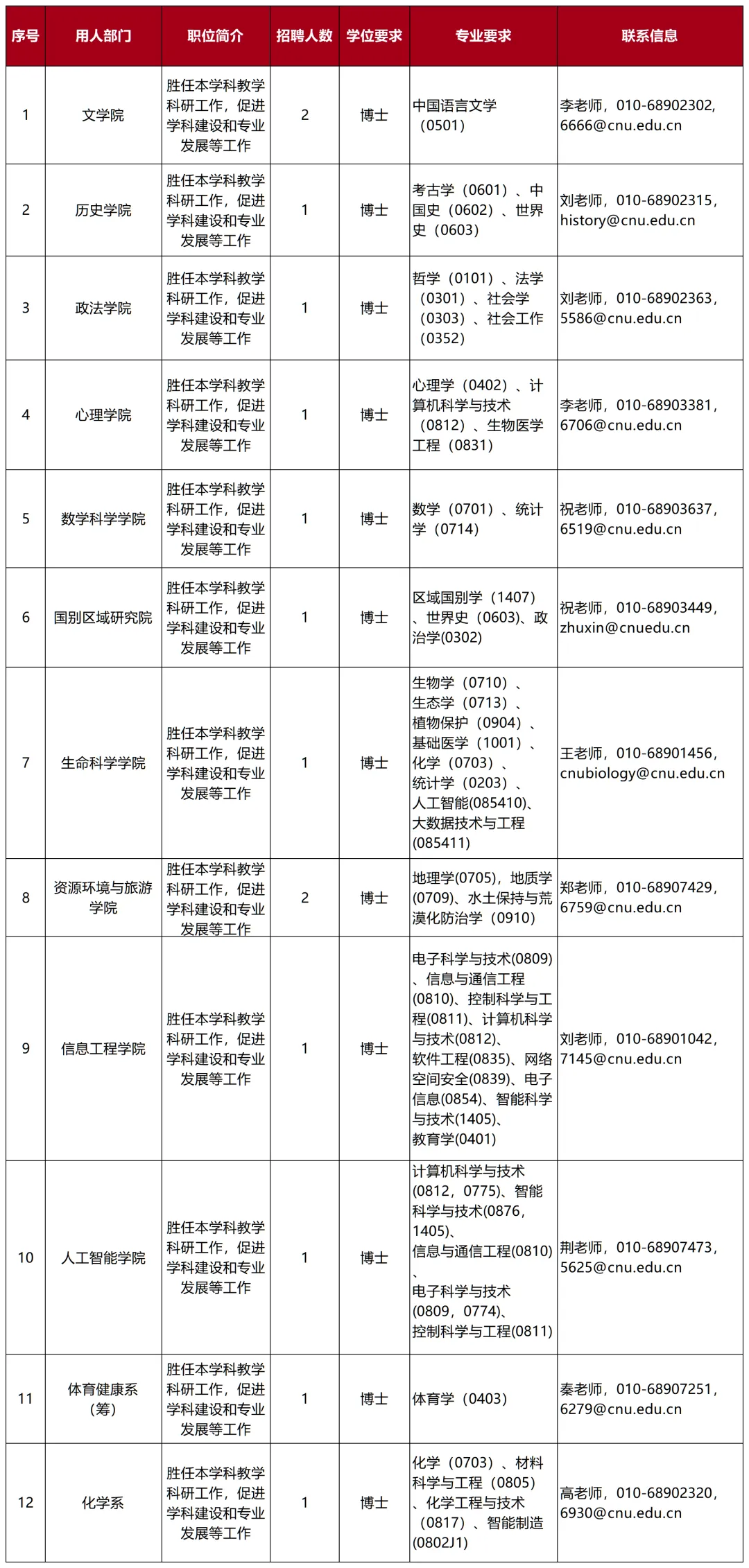 (二)涉及招聘报名、程序等相关问题咨询人事处,电话:010-68902824,邮箱:cnuhr@cnu.edu.cn、sciencehrnet@163.com。