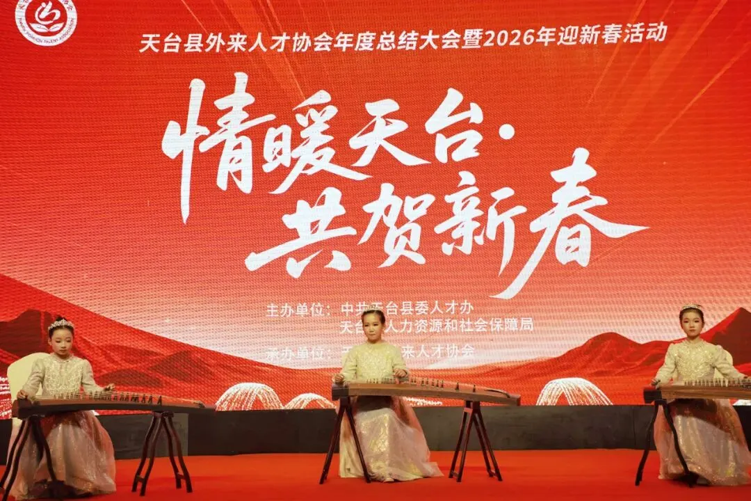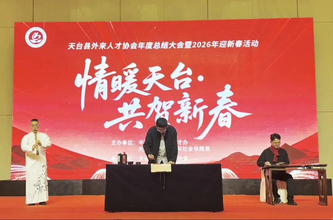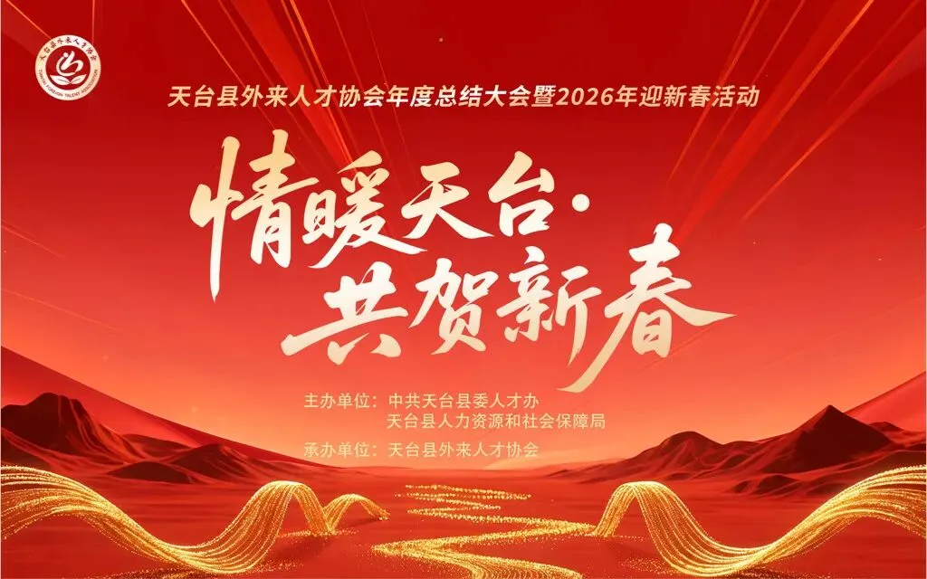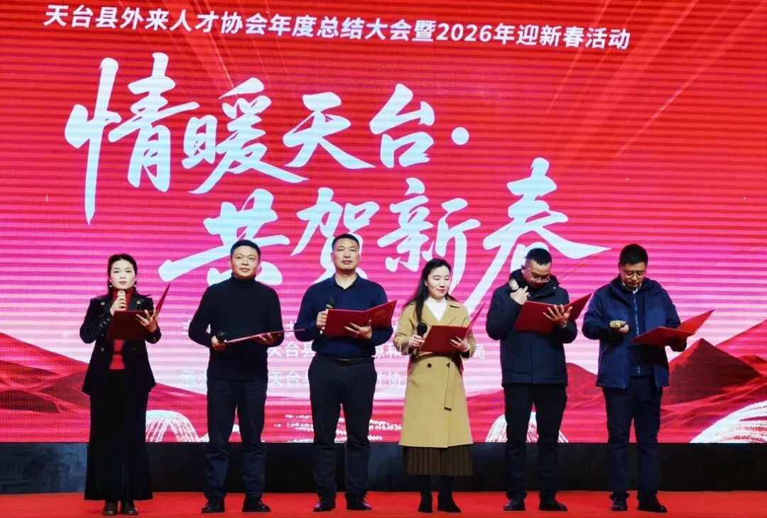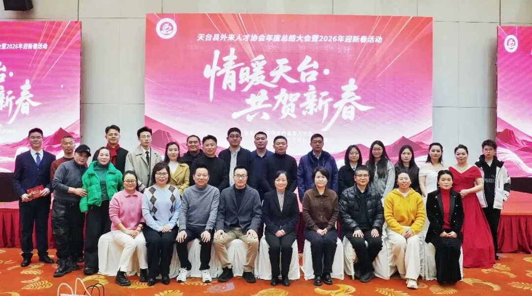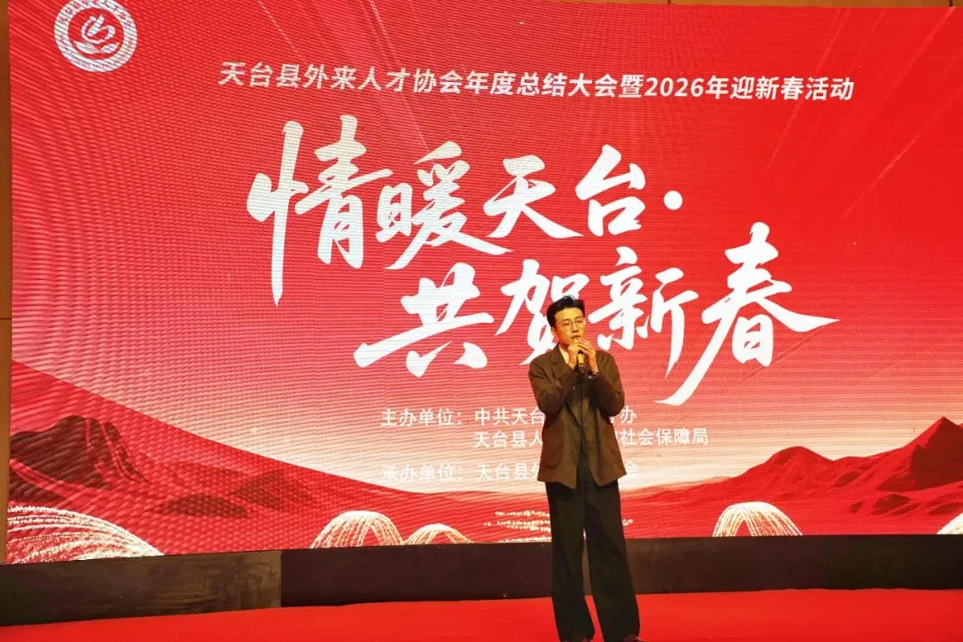 1月31日,由中共天台县委人才办、天台县人力资源和社会保障局主办,天台县外来人才协会承办的“情暖天台 共贺新春”天台县外来人才协会年度总结大会暨2026年迎新春文艺晚会活动在天台开元酒店成功举行。