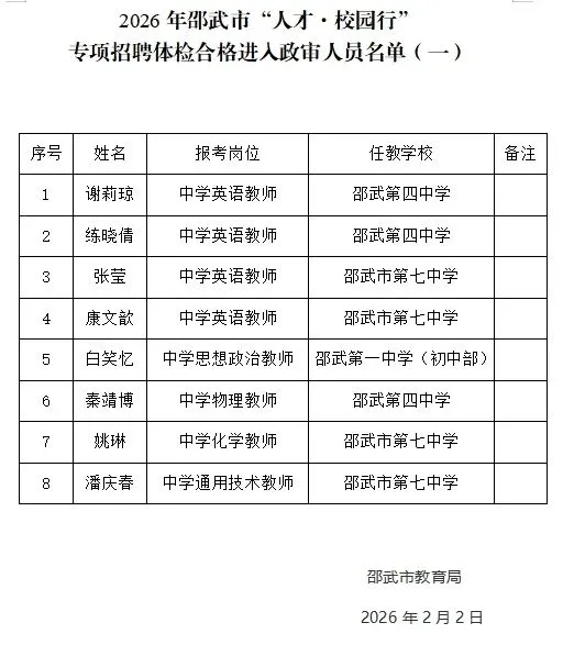 >邵武市“人才•校园行”专项招聘体检合格进入政审人员名单(一)【2则】
