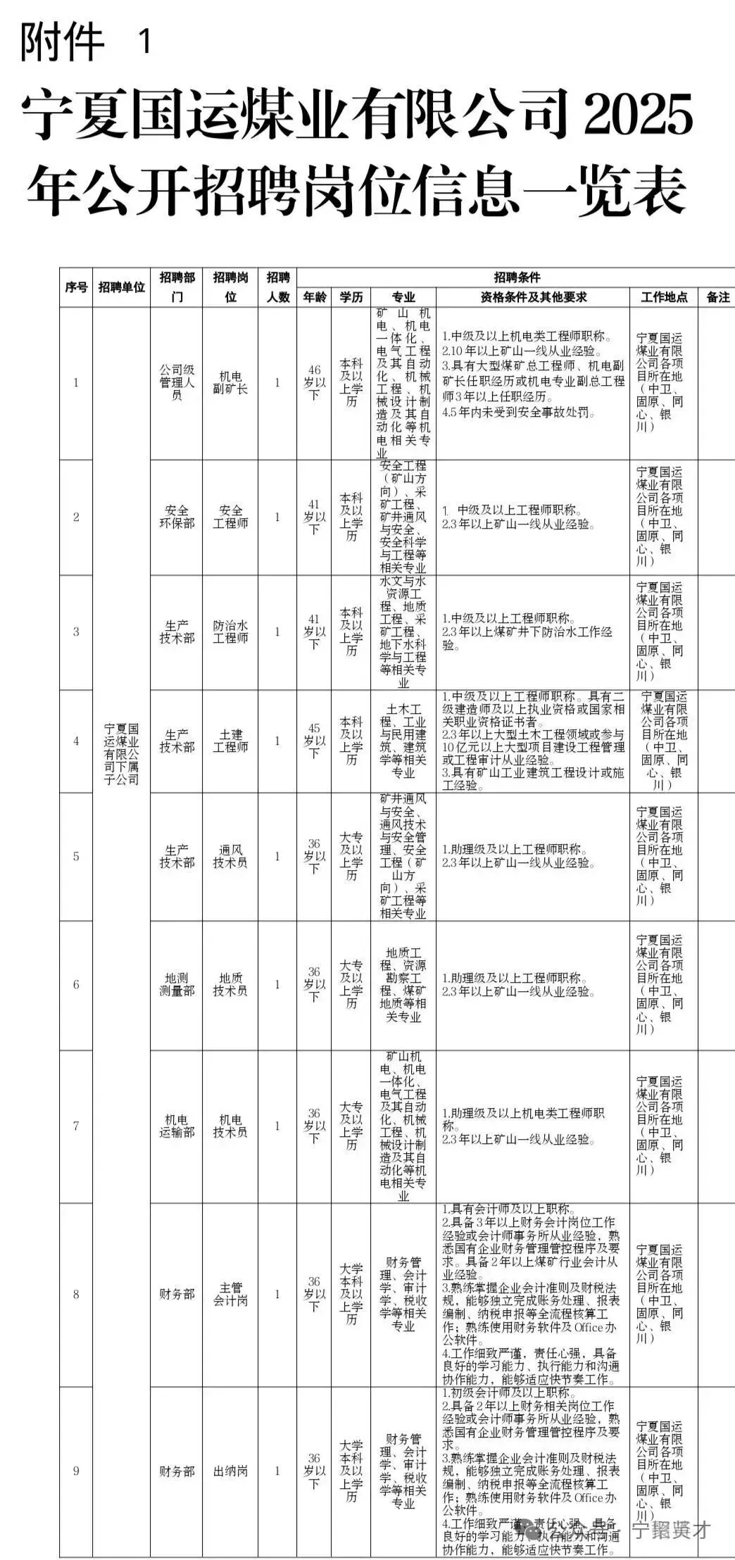 宁夏国运煤业有限公司为宁夏国有资本运营集团有限责任公司全资子公司,成立于2025年11月,注册资本金人民 币一亿元。主要经营范围涵盖:煤炭开采、洗选、销售业务。宁夏国运煤业有限公司权属子公司计划面向社会公开招聘煤矿管理人员、技术员、财务人员共9名: 一、招聘原则 坚持党管人才,坚持德才兼备、以德为先、任人唯贤,坚持“公开、平等、竞争、择优”的原则,严格执行组织人事工作纪律,面向社会公开择优招聘工作人员。二、招聘岗位