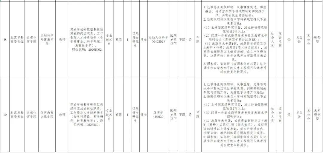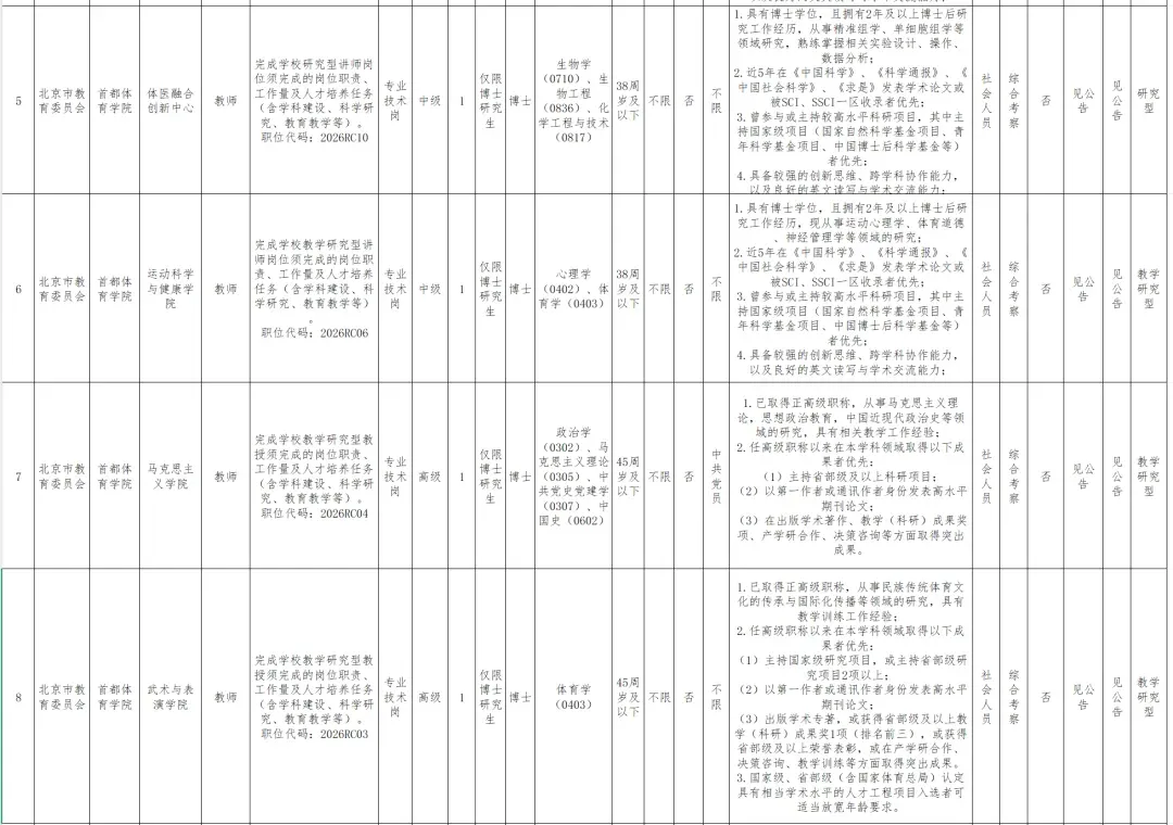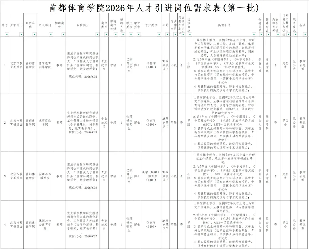 首都体育学院2026年人才引进(第一批)计划招聘10人,岗位具体情况见附件:《首都体育学院2026年人才引进岗位需求表》。