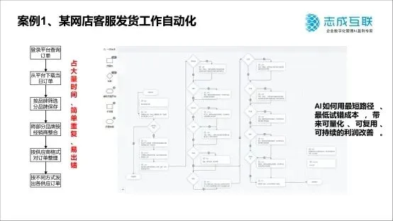通过流程创造者,员工顺序拖拽组合可以完成主要自动化流程,部分复杂的表格数据处理则可利用AI编程来实现。如视频所示,原来每天4-5小时的发货数据处理,仅需要10分钟就可运行完成,这极大提高客服效率减少工作量。当然、处理退换货流程,由于退换货的原因及情况多,则需要利用智能体调用大模型来处理。